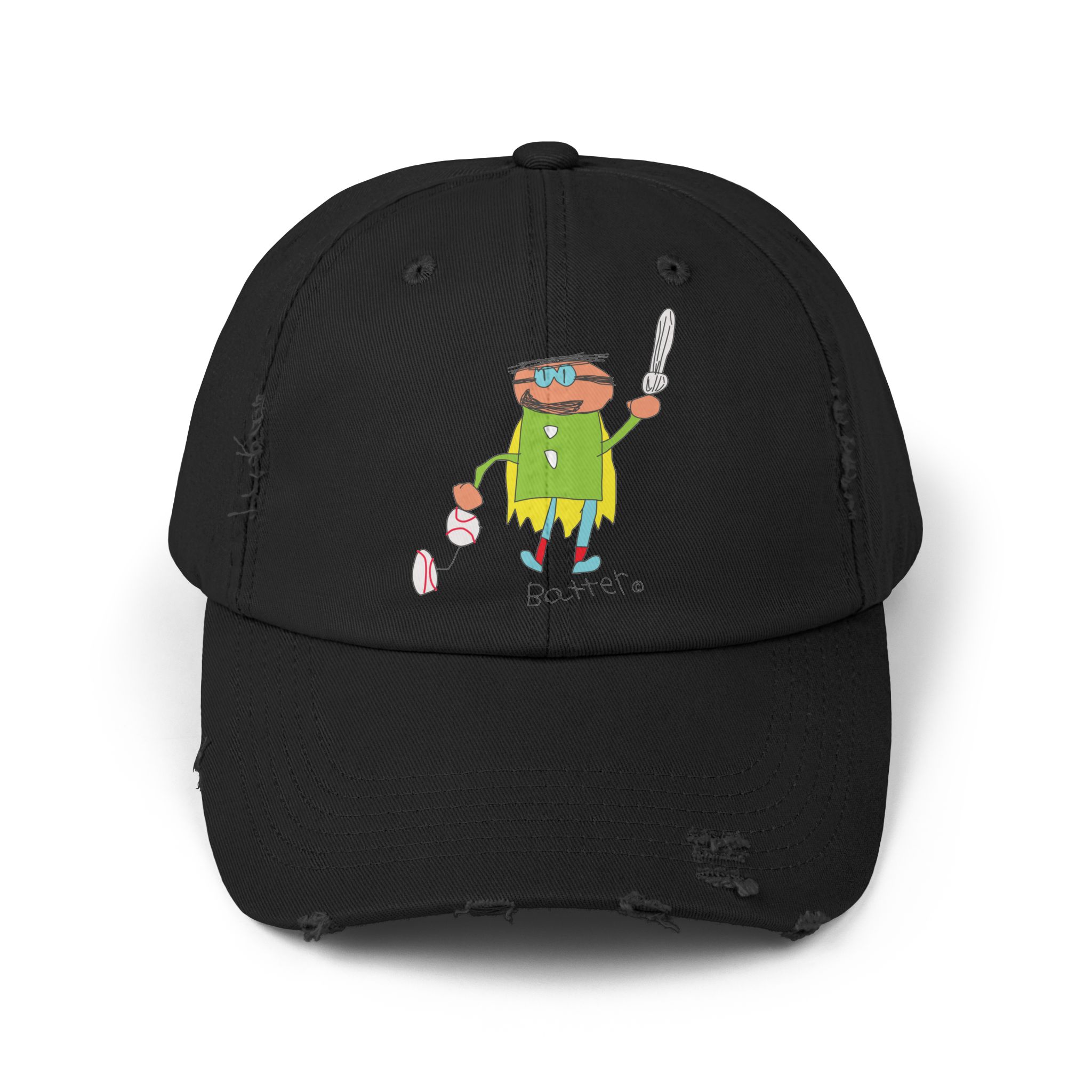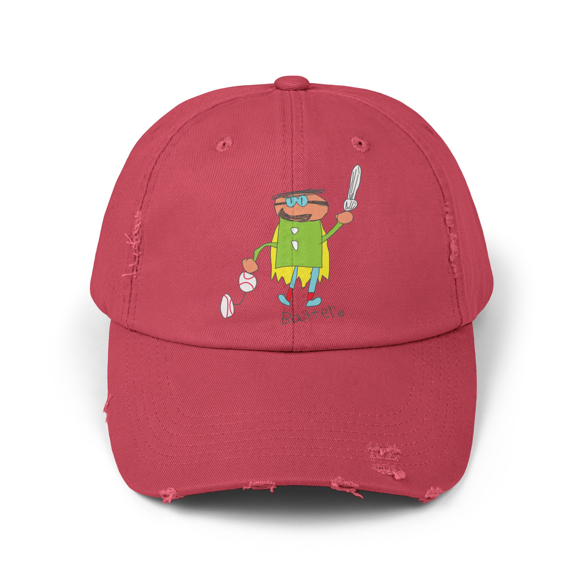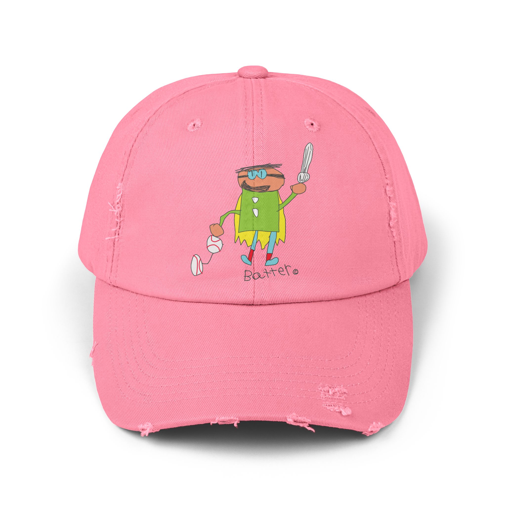 Our Batter distressed cotton twill cap brings easygoing, lived-in style with its low-profile 6-panel design, curved visor, and unique frayed details—no two caps are exactly alike. A colorful DTF-printed Batter graphic adds a playful, subcultural touch, while the self-fabric strap with metal D-ring keeps the fit secure.