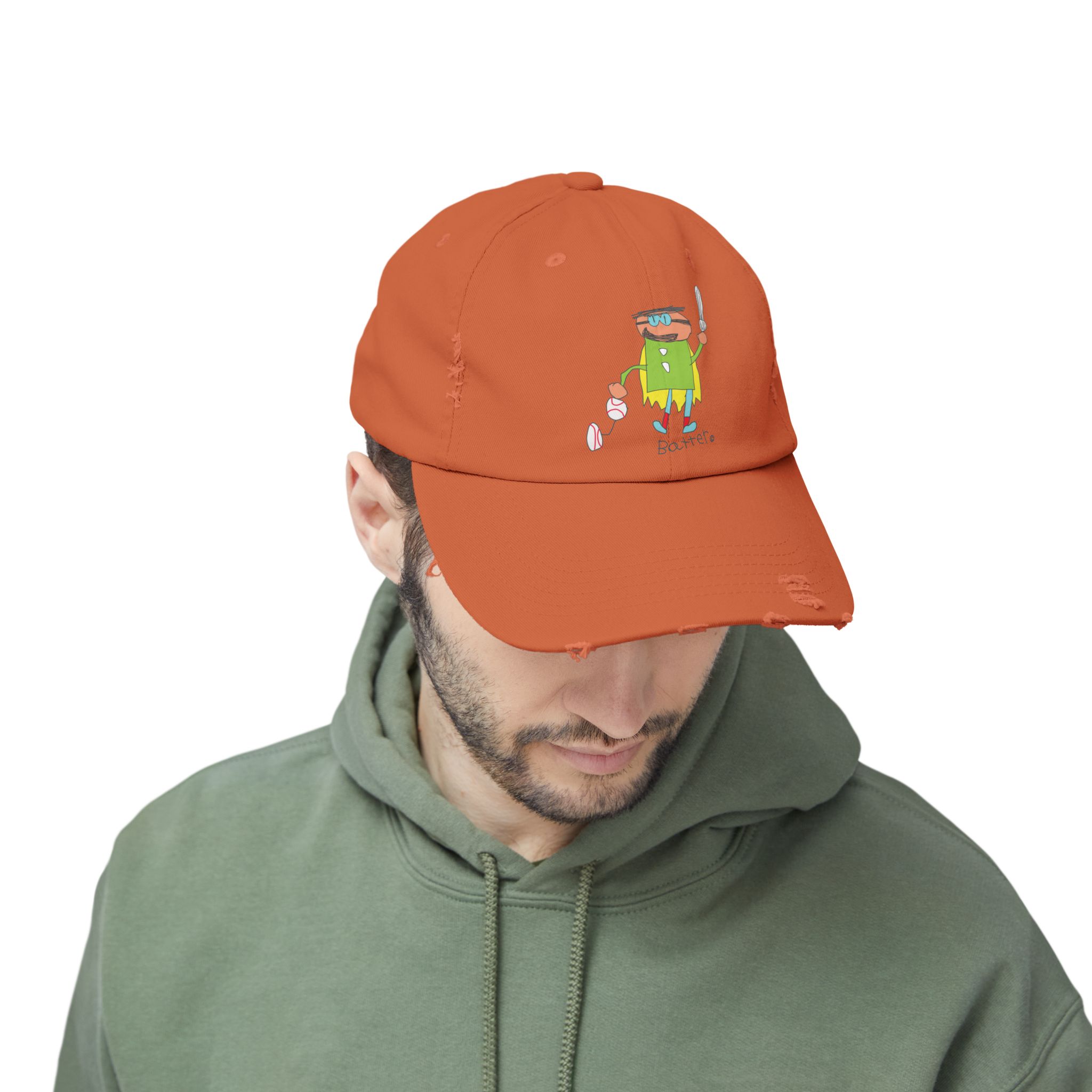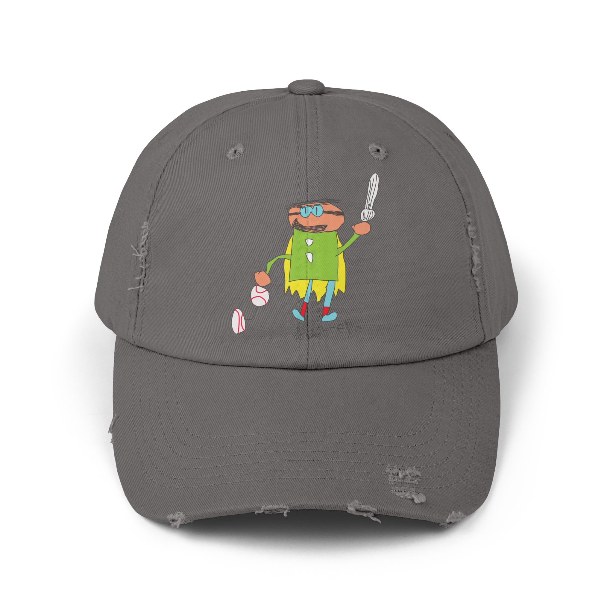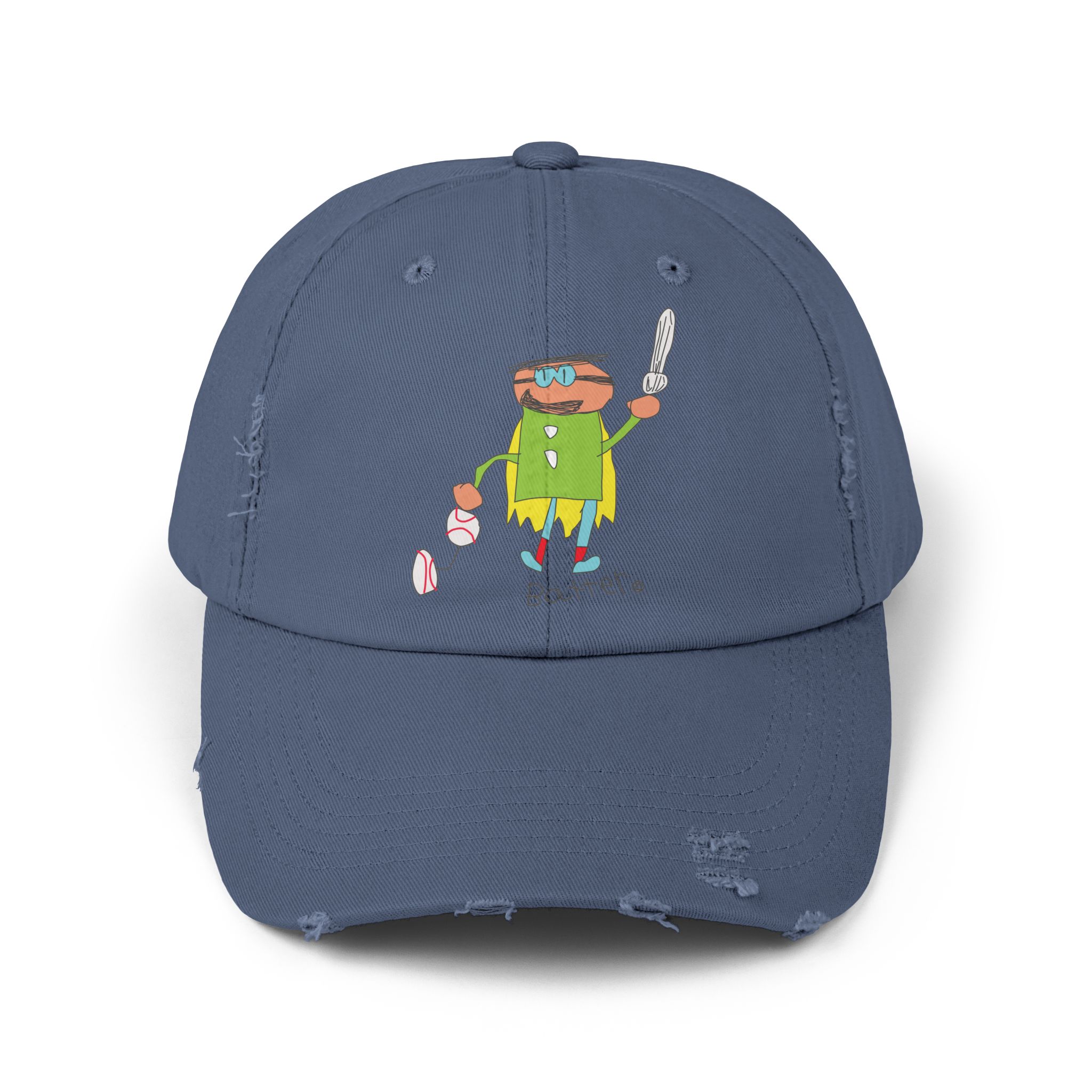 Our Batter distressed cotton twill cap brings easygoing, lived-in style with its low-profile 6-panel design, curved visor, and unique frayed details—no two caps are exactly alike. A colorful DTF-printed Batter graphic adds a playful, subcultural touch, while the self-fabric strap with metal D-ring keeps the fit secure.