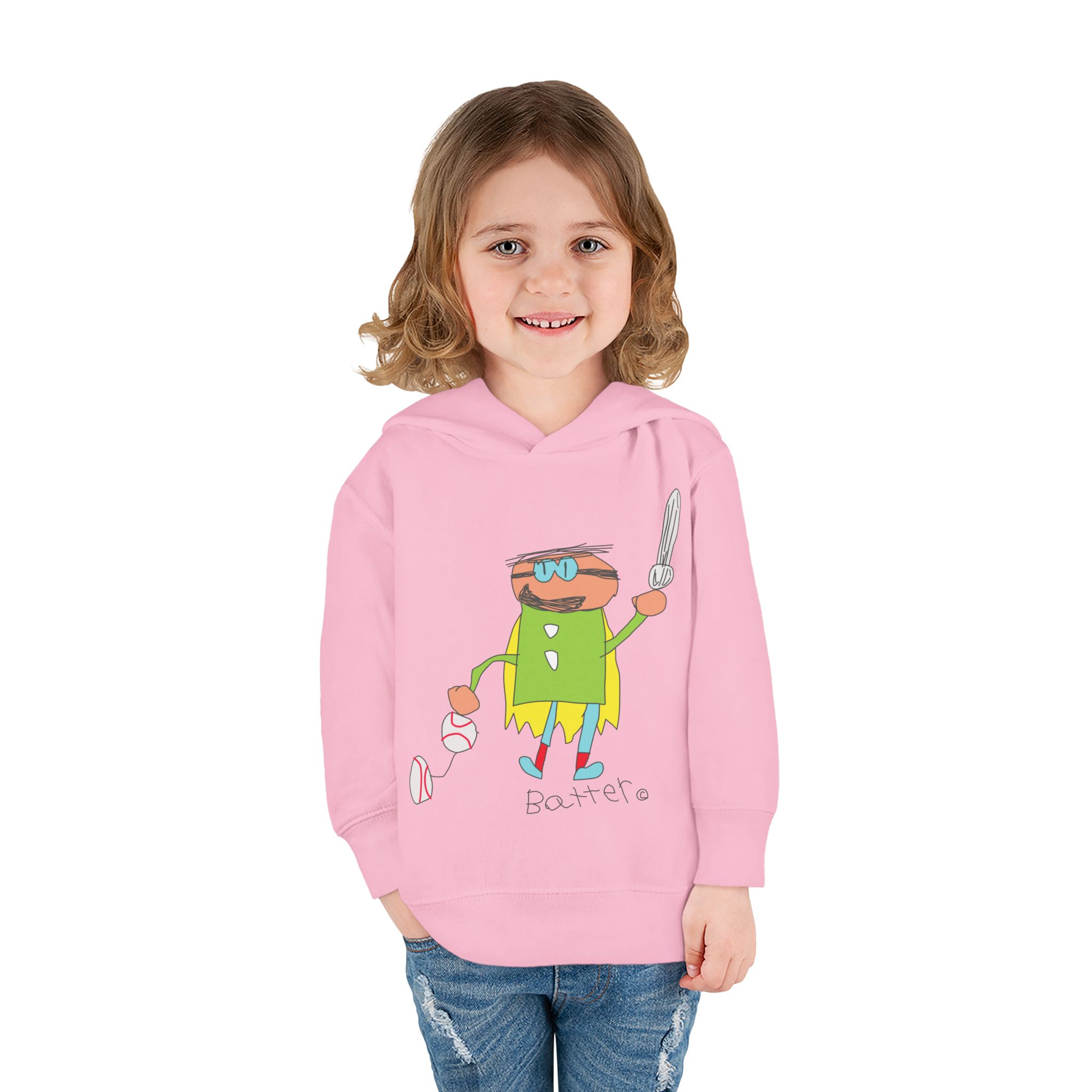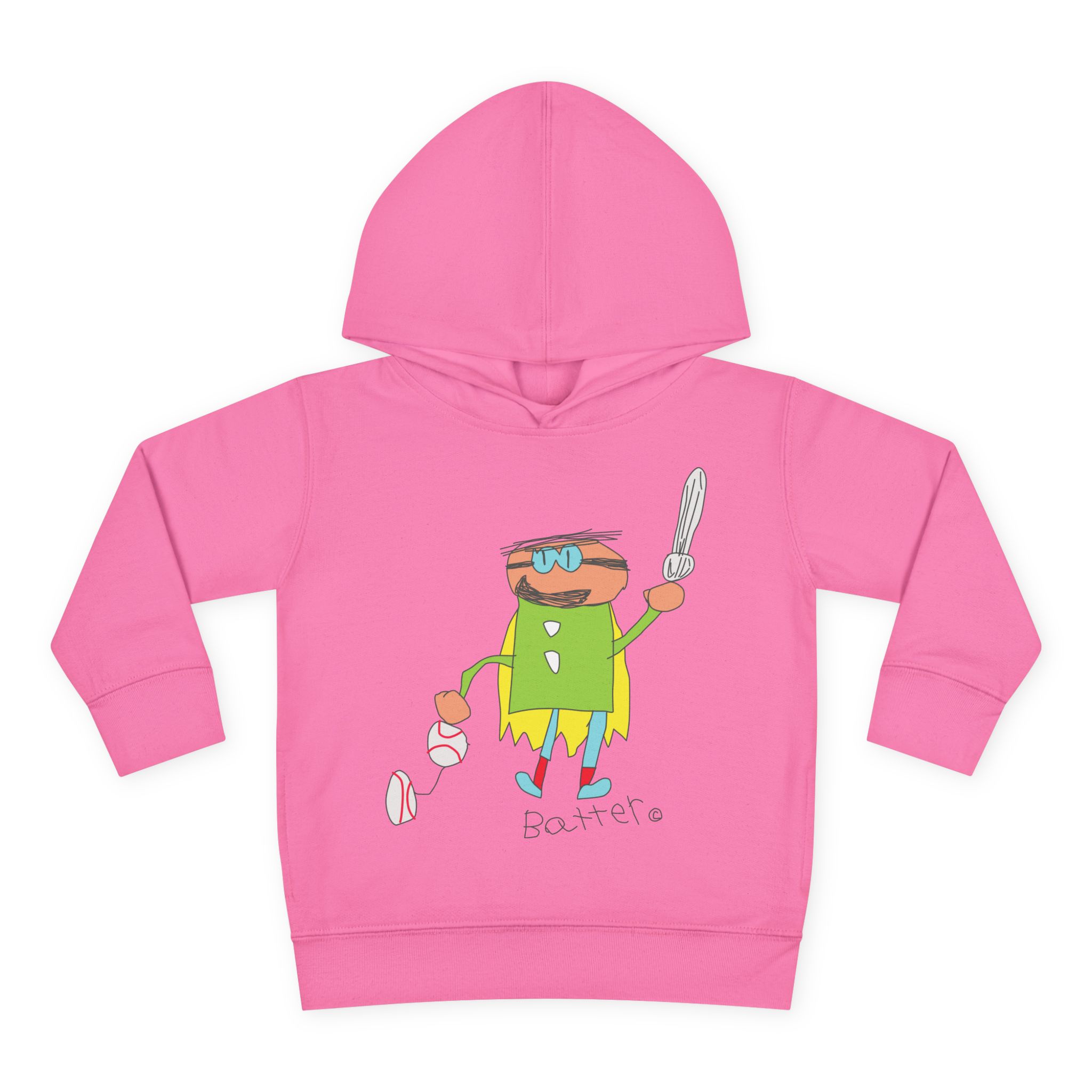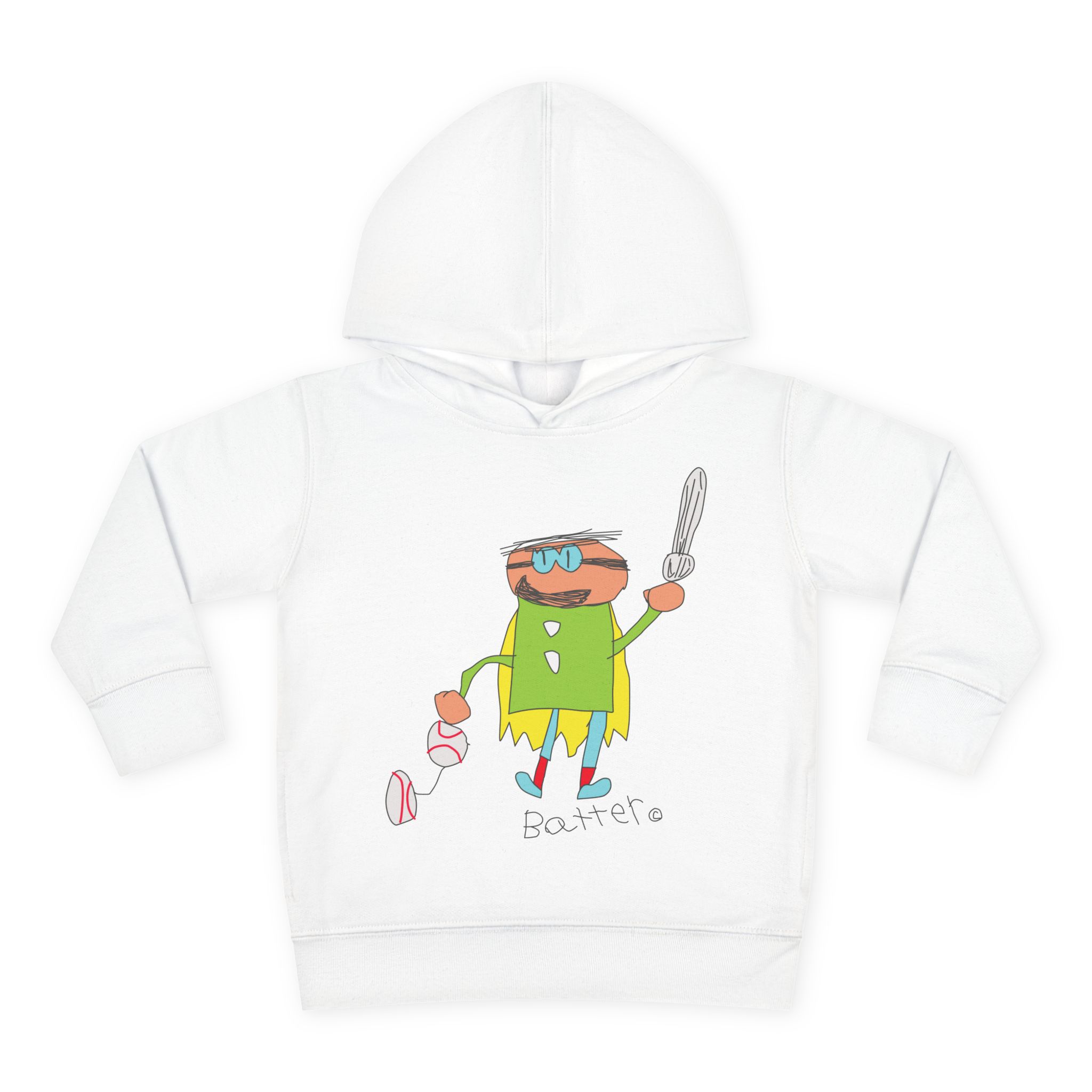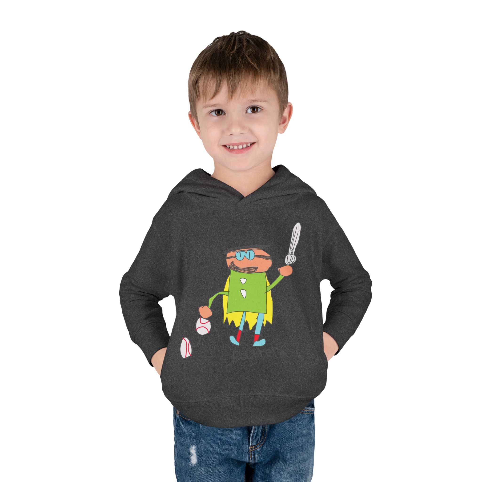 Cozy fleece-knit hoodie featuring our playful Batter character, a soft jersey-lined hood, ribbed cuffs, and handy side pockets. Gentle on skin and tough enough for spills—perfect for adventures, park days, or story time.