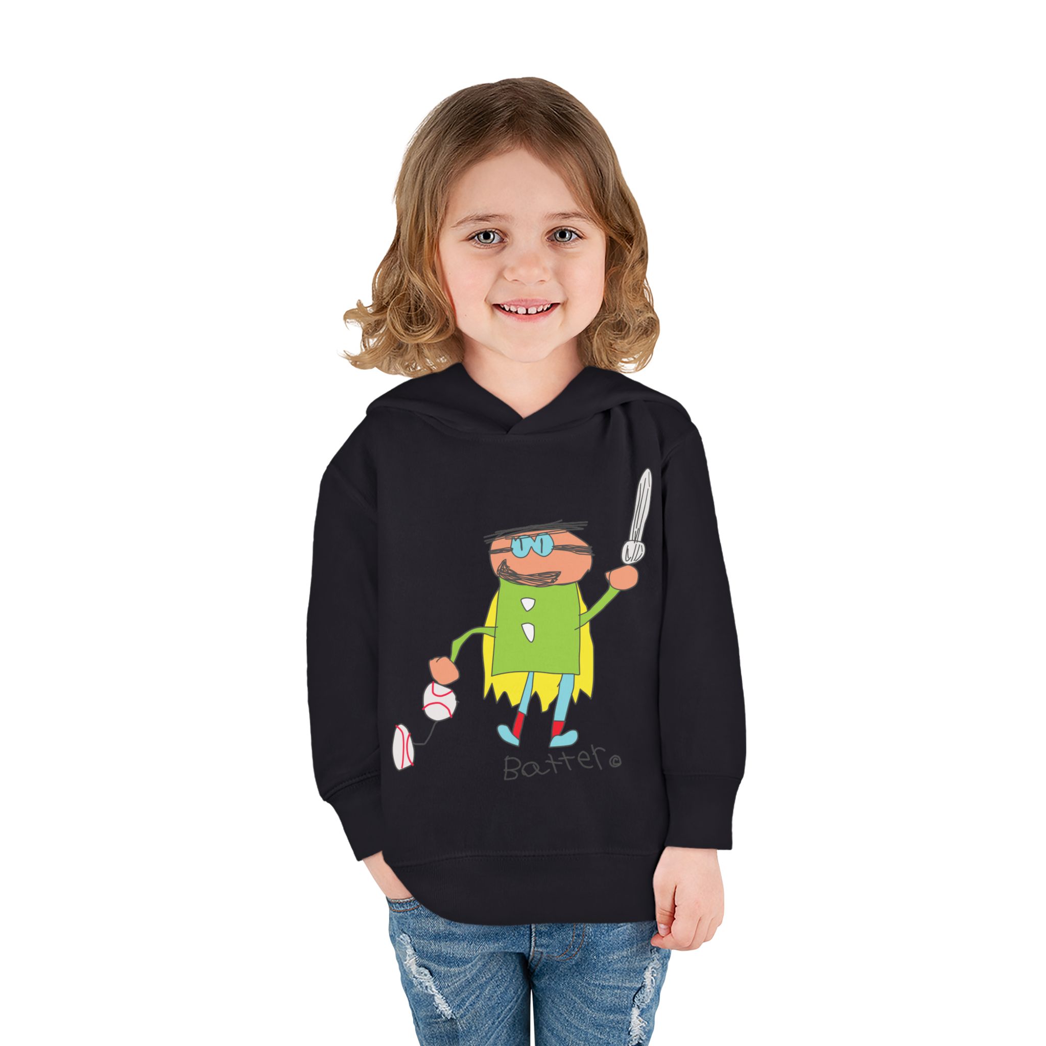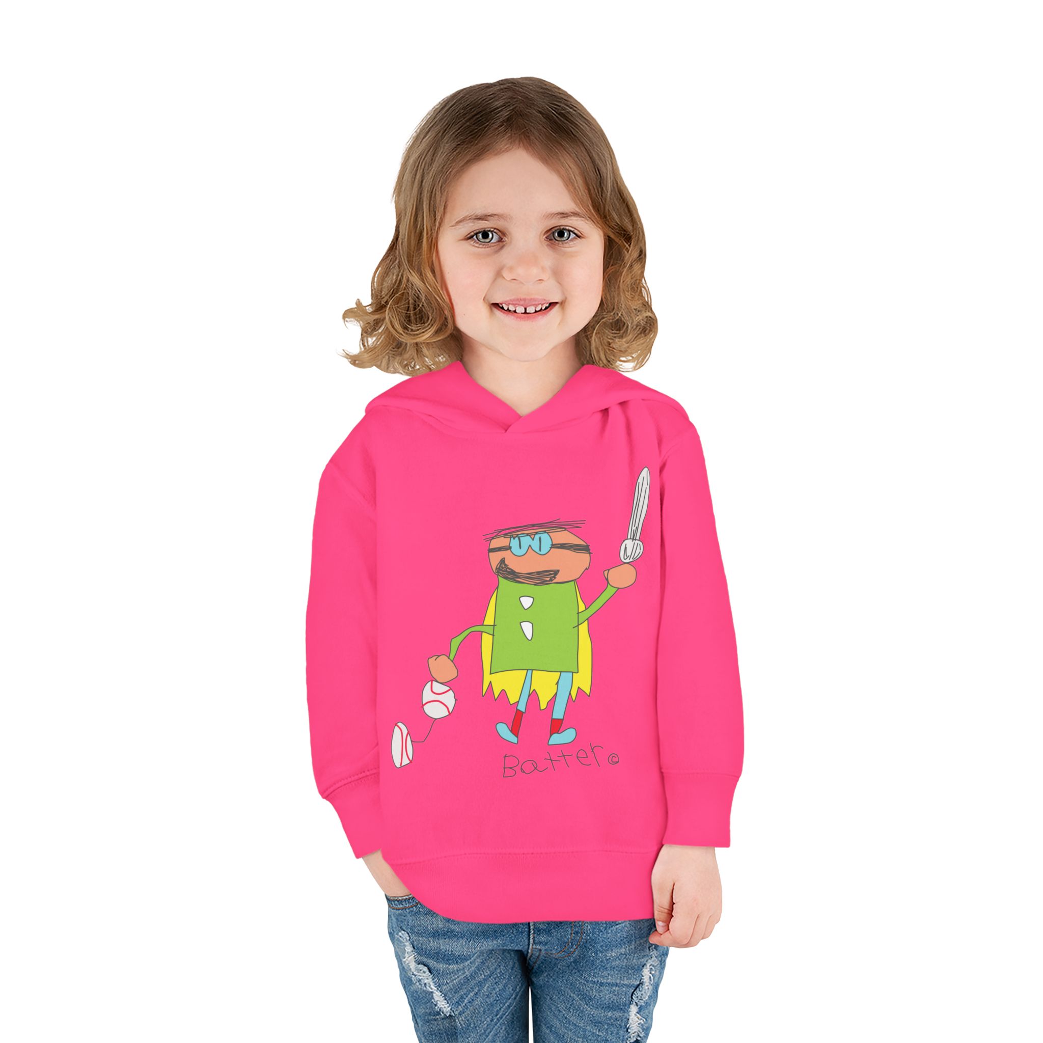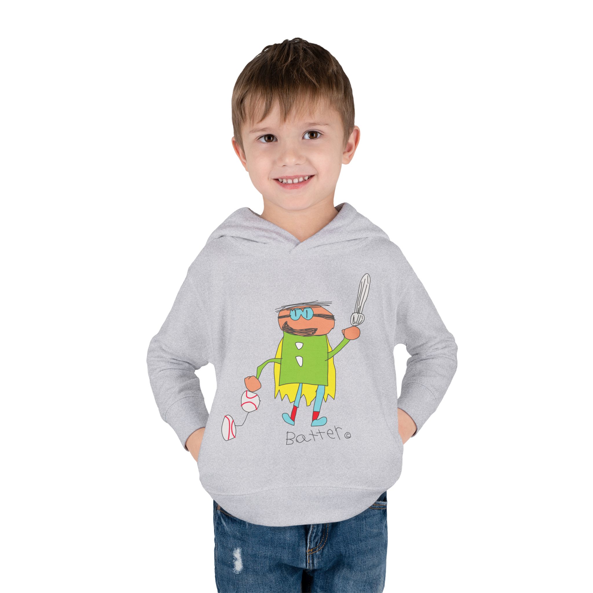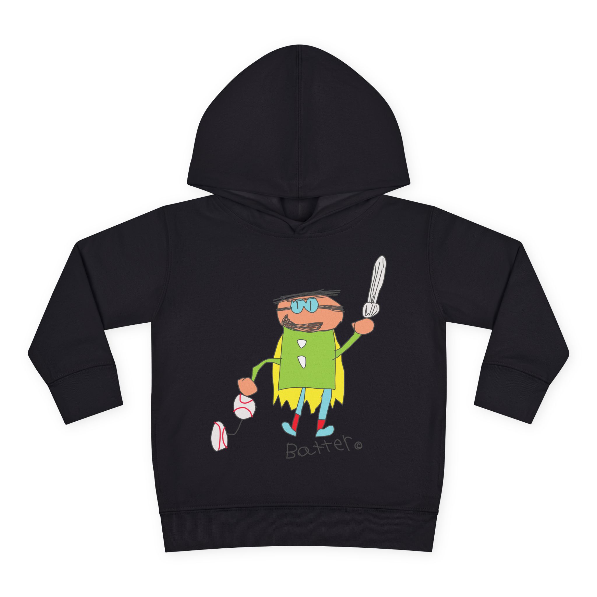 Cozy fleece-knit hoodie featuring our playful Batter character, a soft jersey-lined hood, ribbed cuffs, and handy side pockets. Gentle on skin and tough enough for spills—perfect for adventures, park days, or story time.