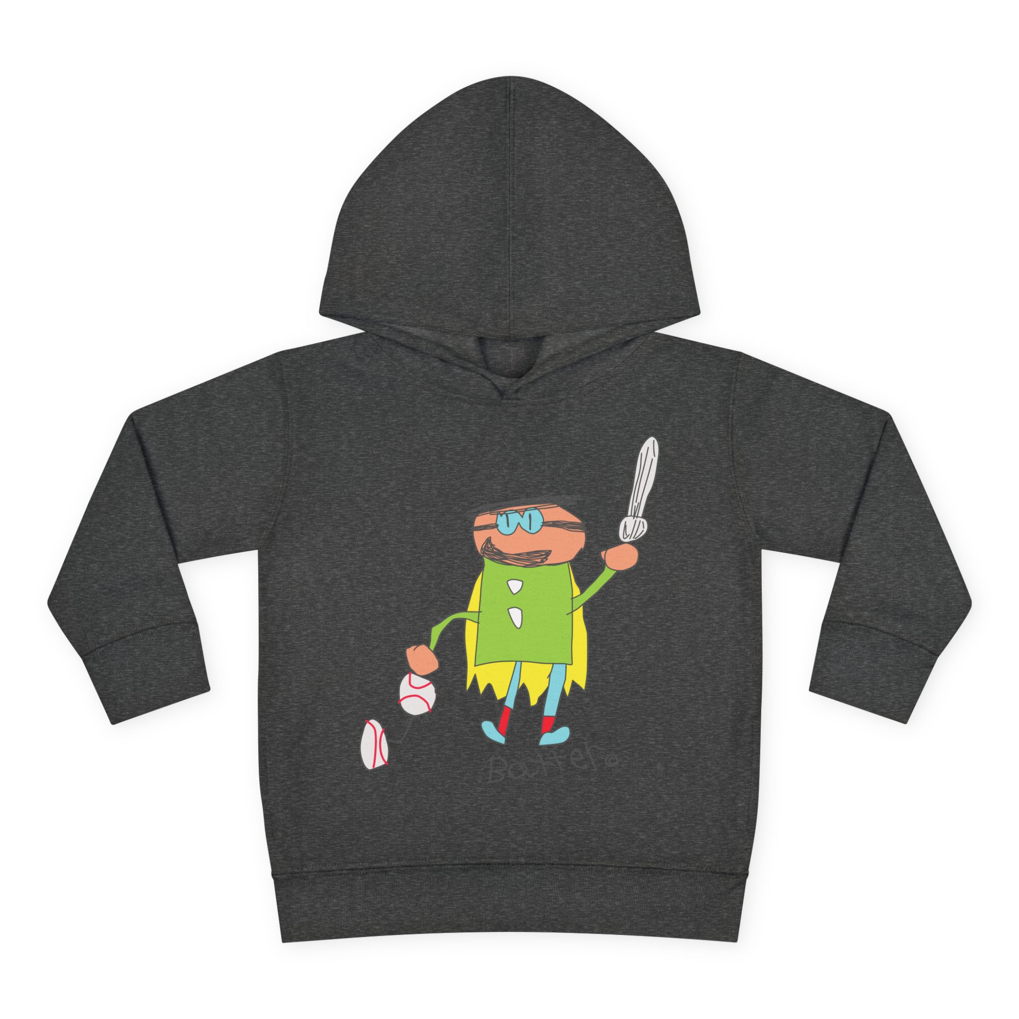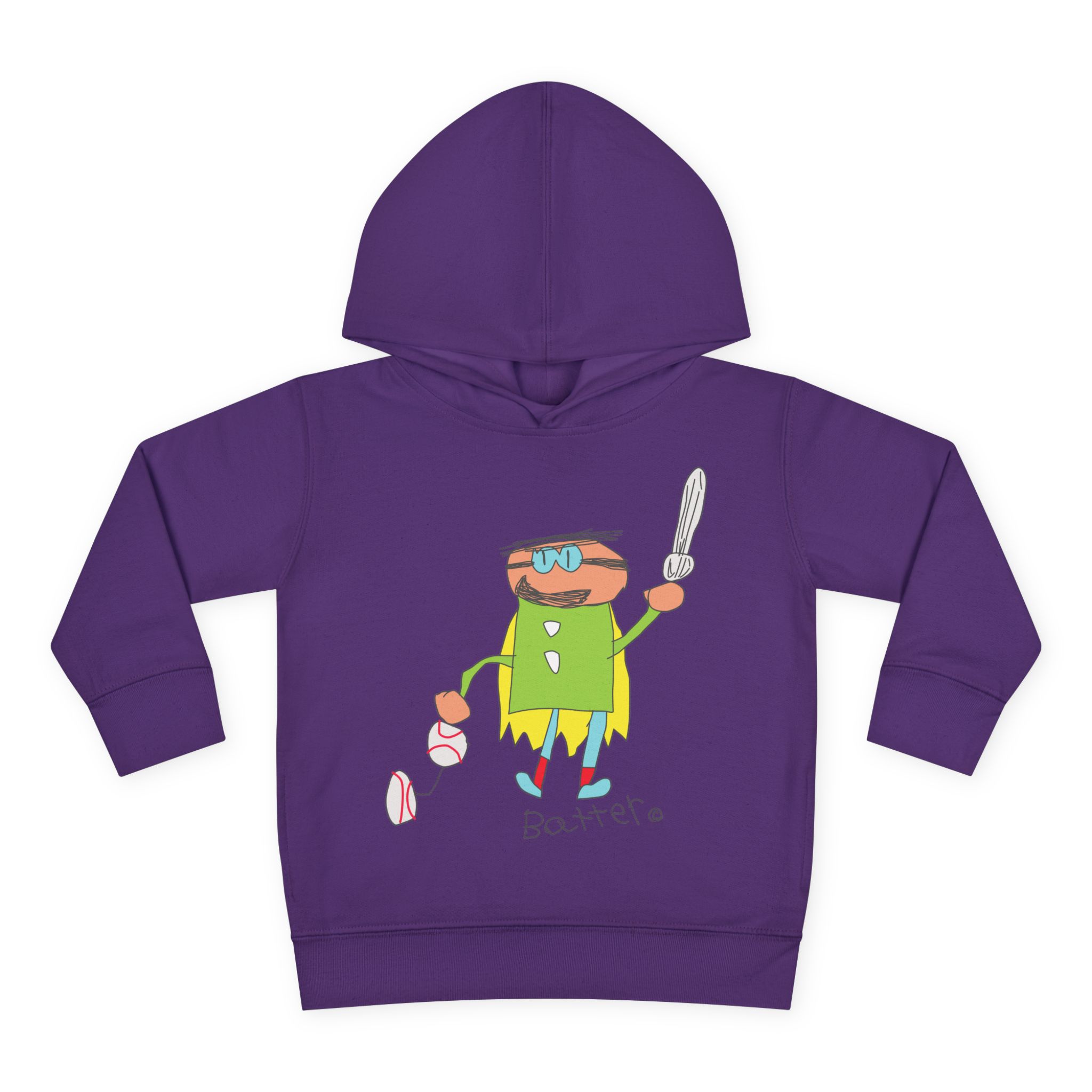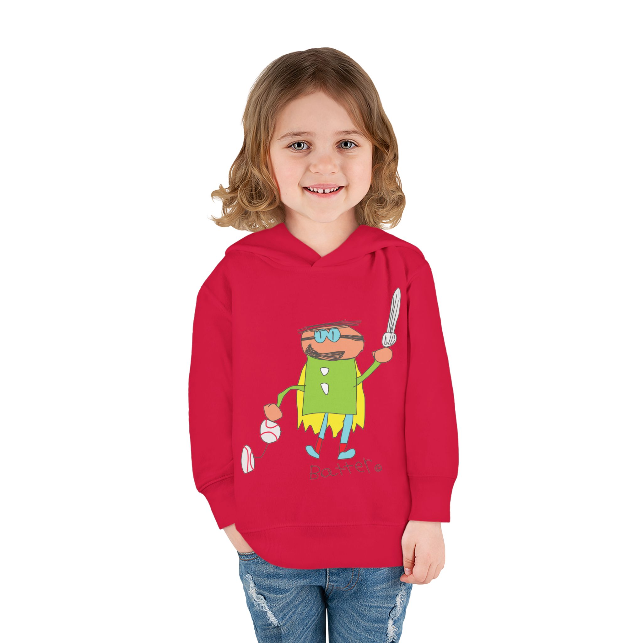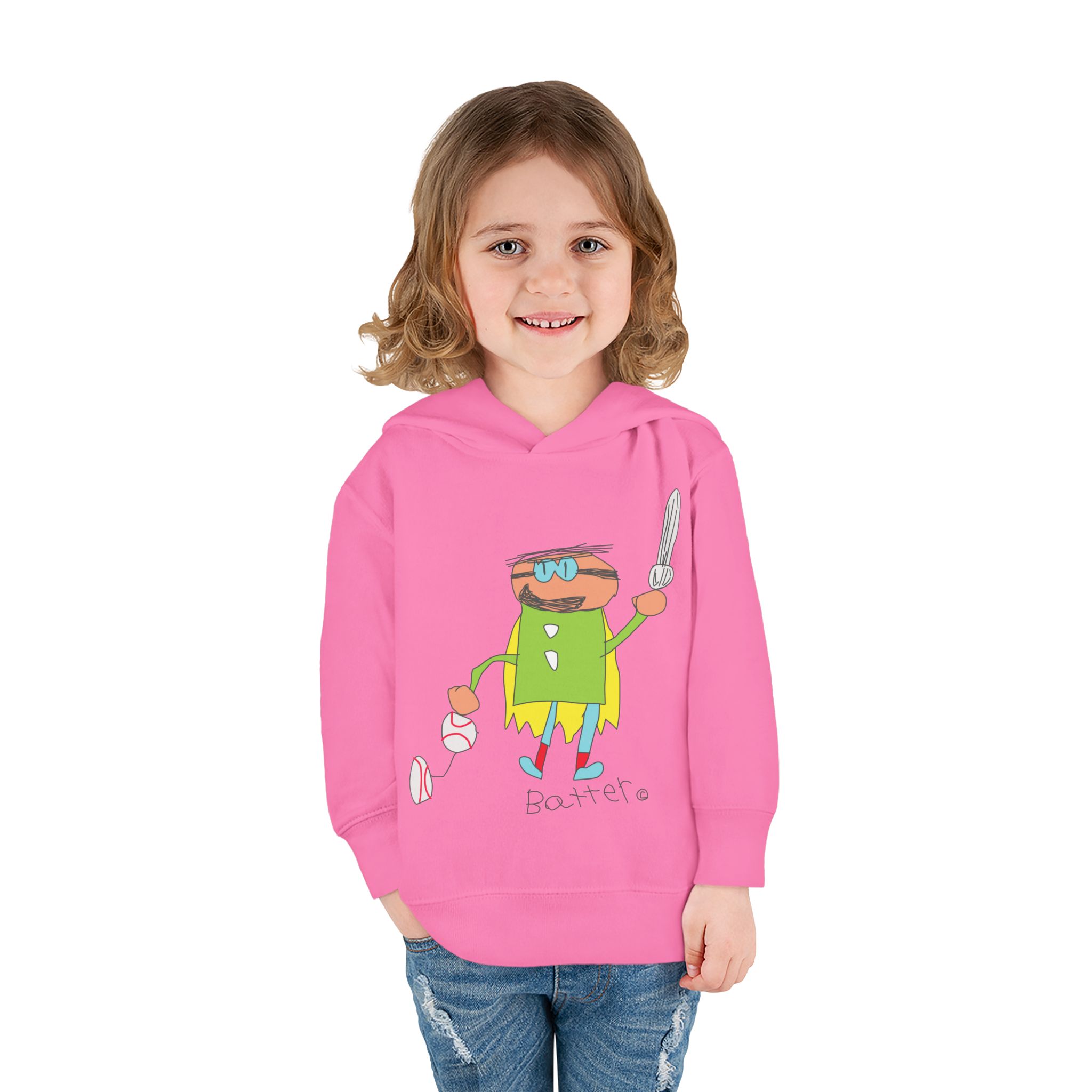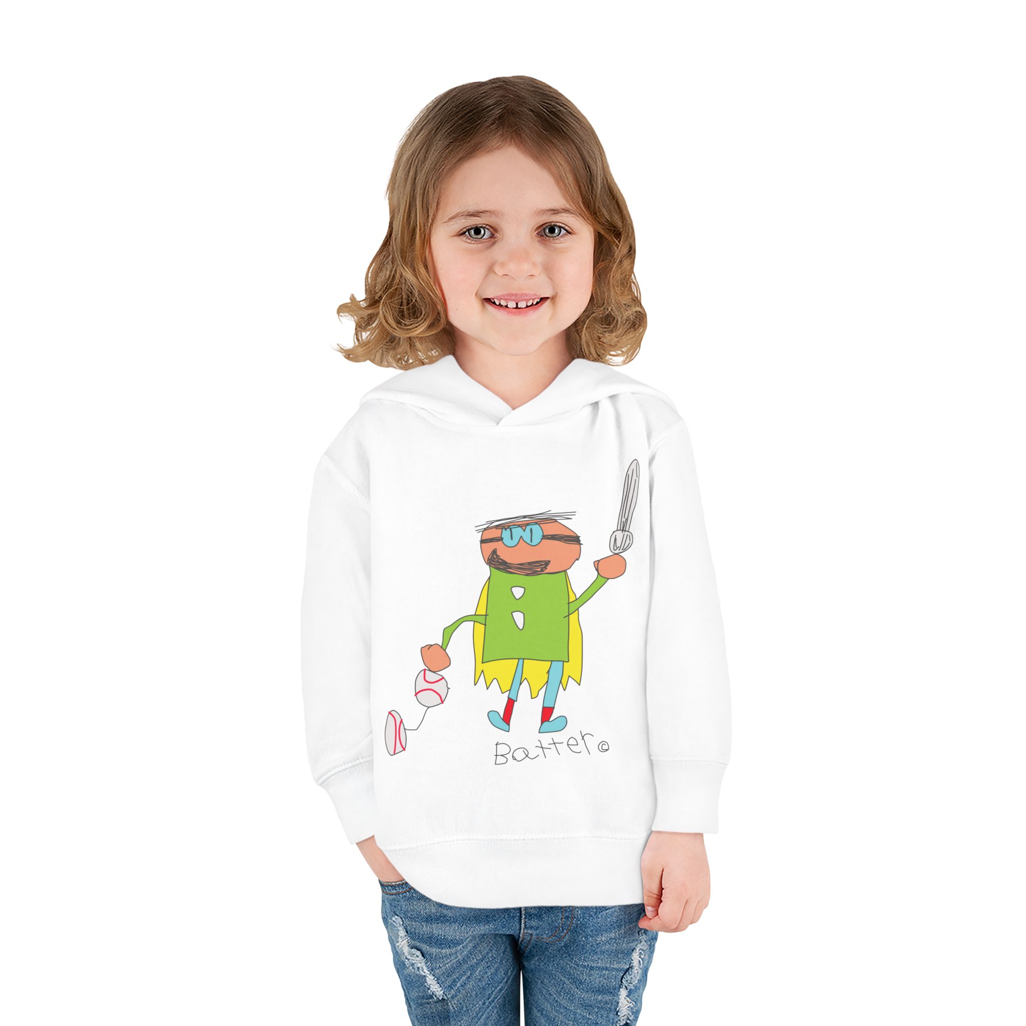 Cozy fleece-knit hoodie featuring our playful Batter character, a soft jersey-lined hood, ribbed cuffs, and handy side pockets. Gentle on skin and tough enough for spills—perfect for adventures, park days, or story time.