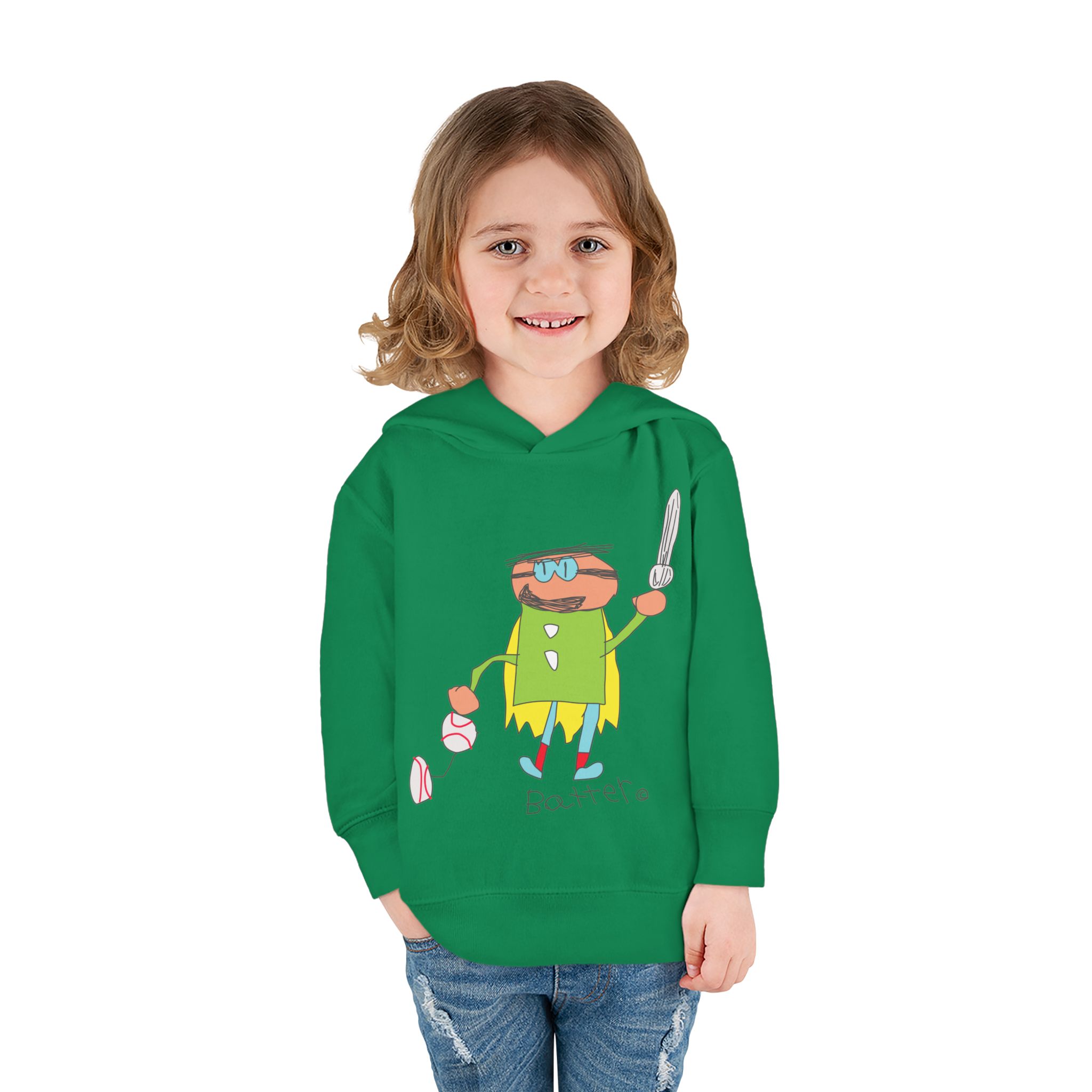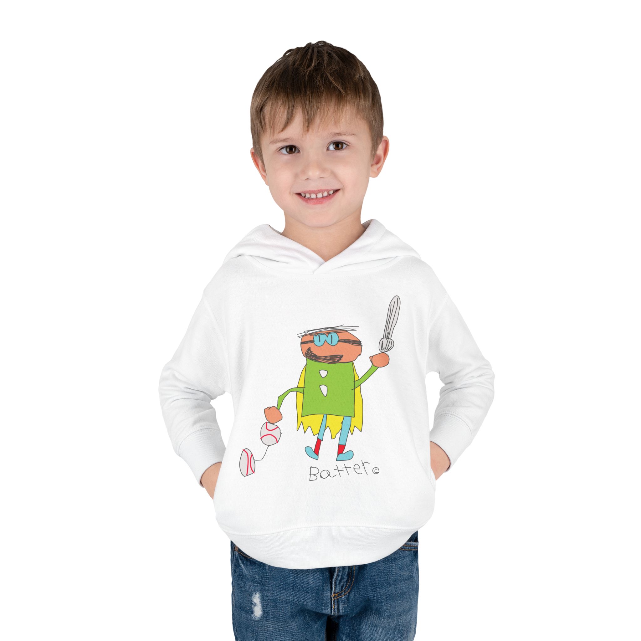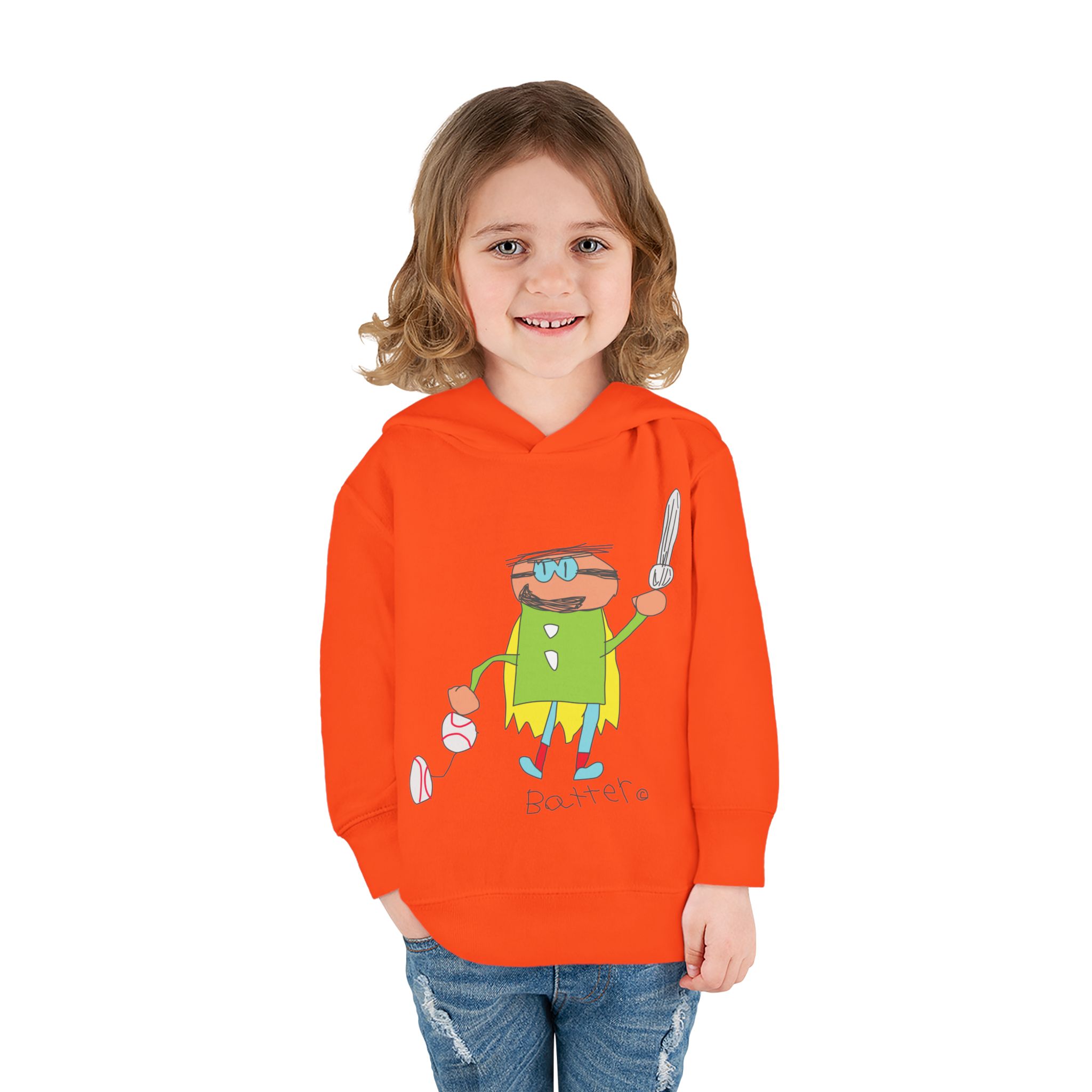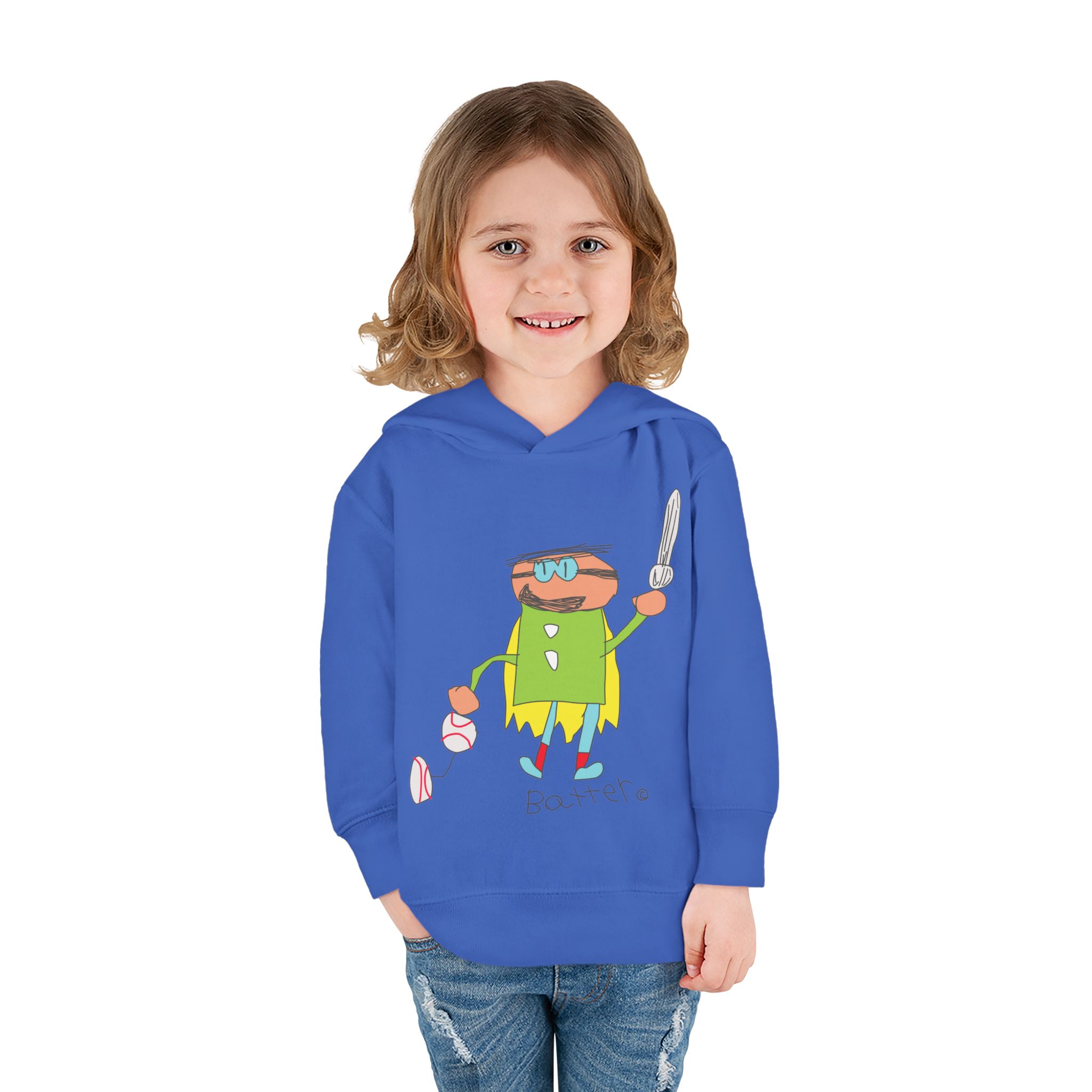 Cozy fleece-knit hoodie featuring our playful Batter character, a soft jersey-lined hood, ribbed cuffs, and handy side pockets. Gentle on skin and tough enough for spills—perfect for adventures, park days, or story time.