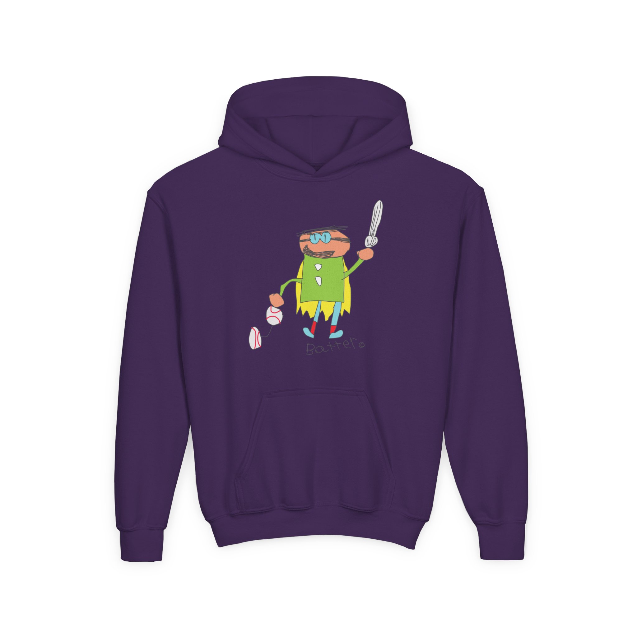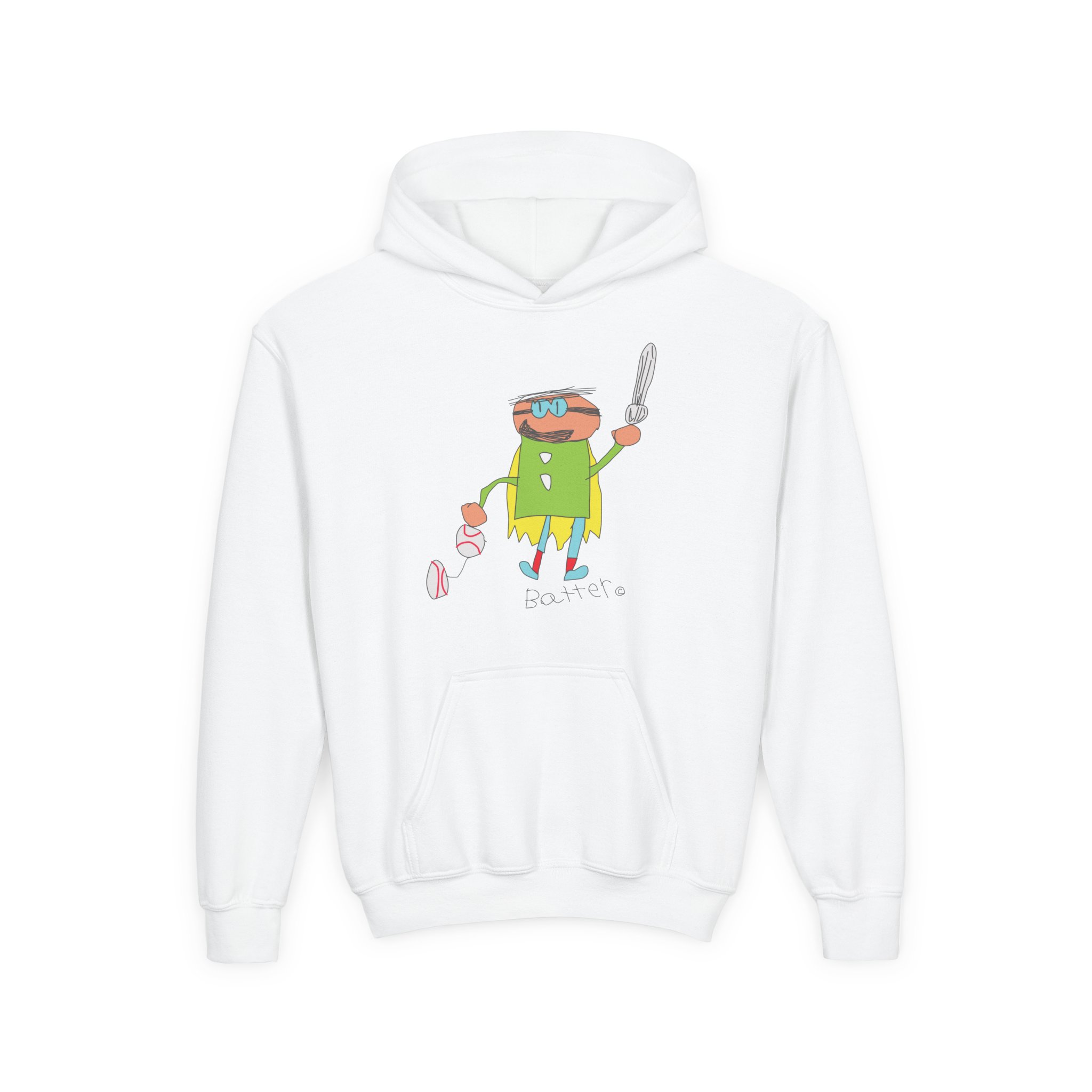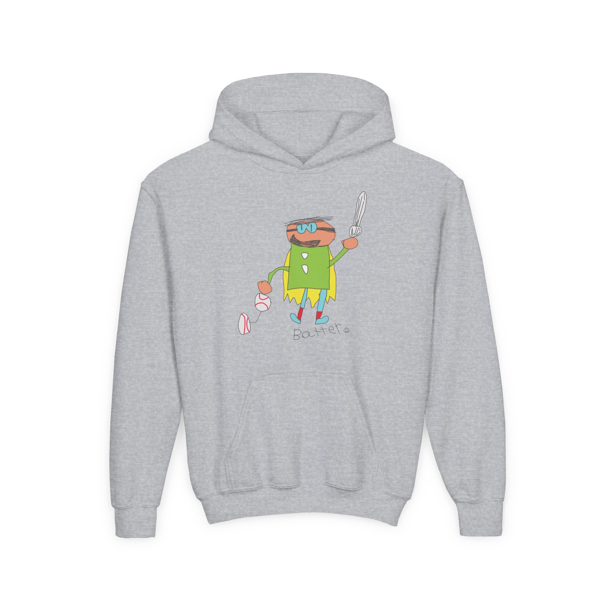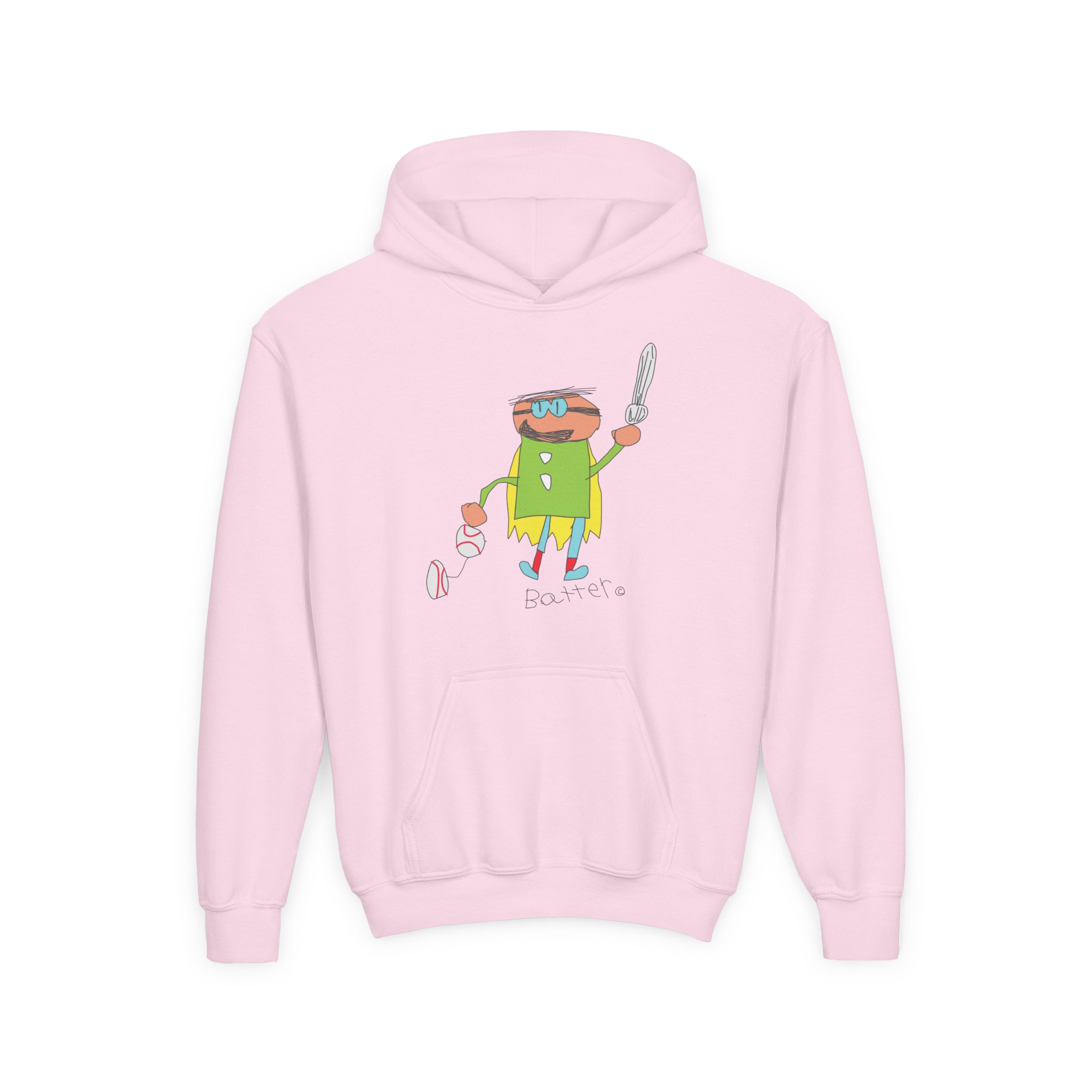 Soft, cozy youth hoodie with our whimsical Batter character art, warm fabric, and a roomy kangaroo pocket. Durable details keep it comfy through school mornings, park trips, and craft time.