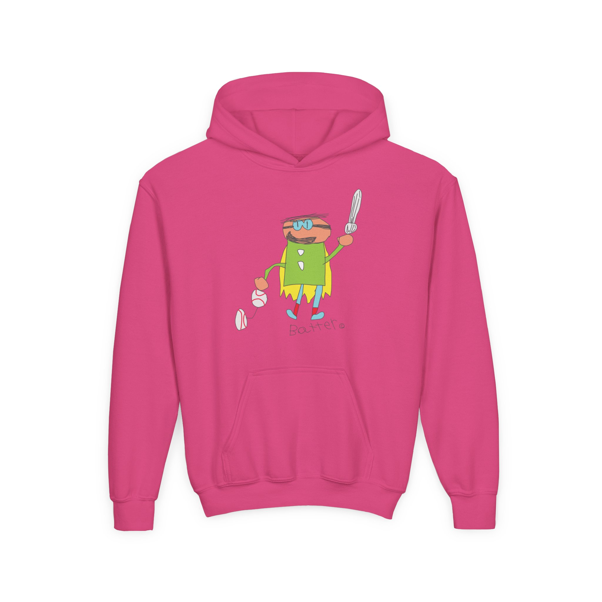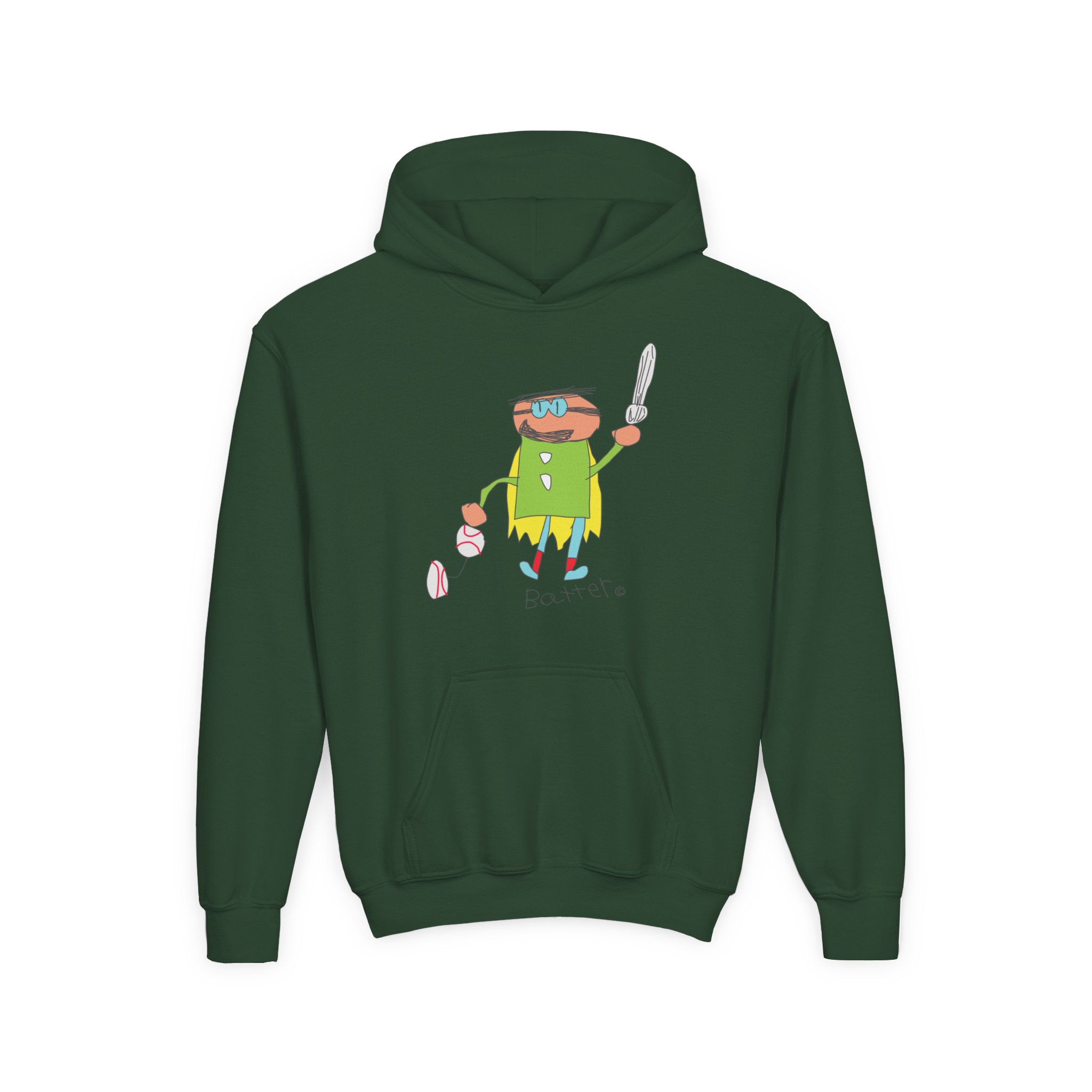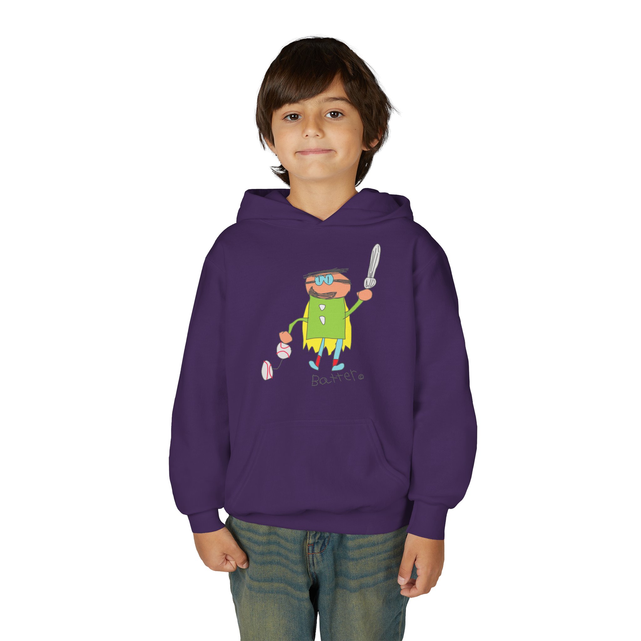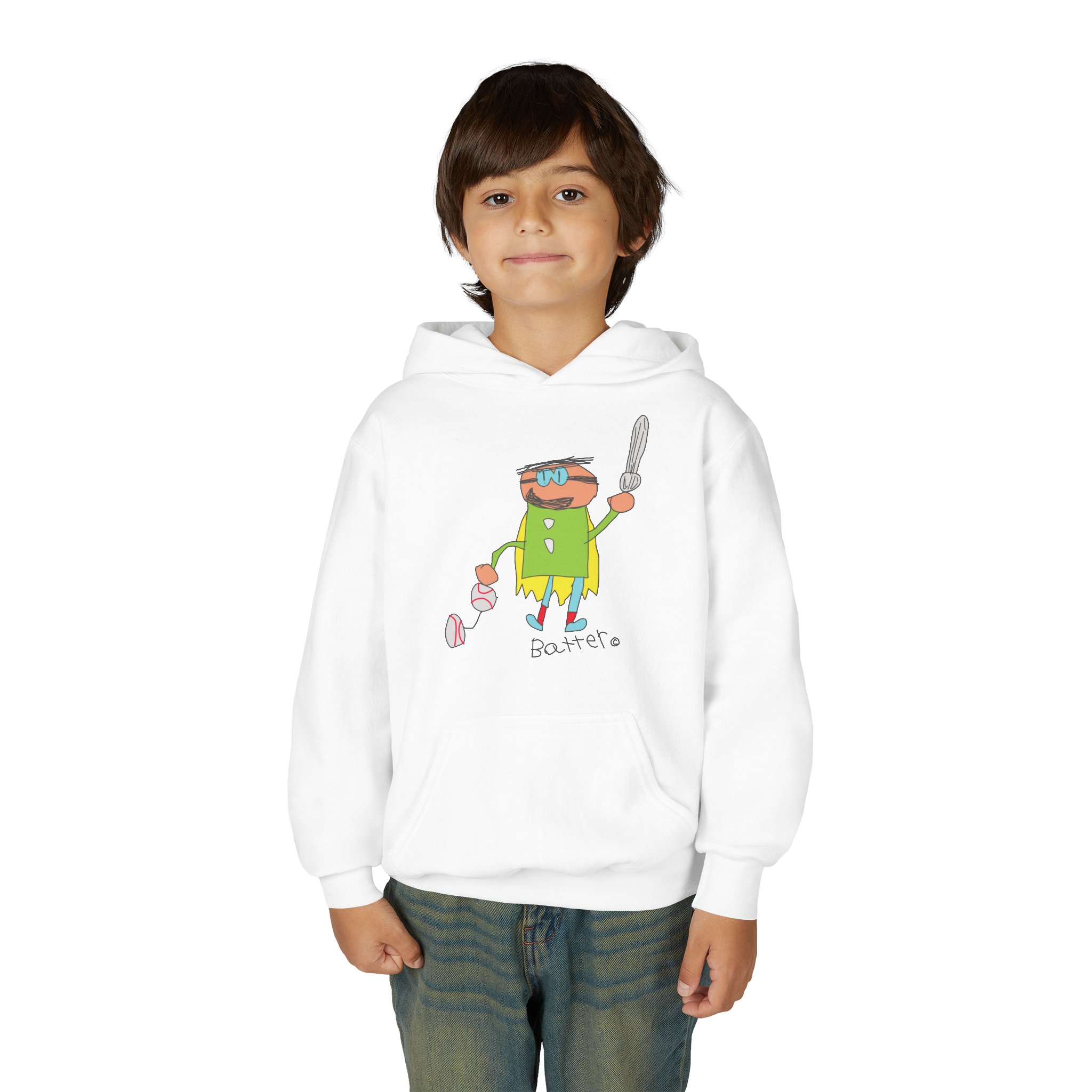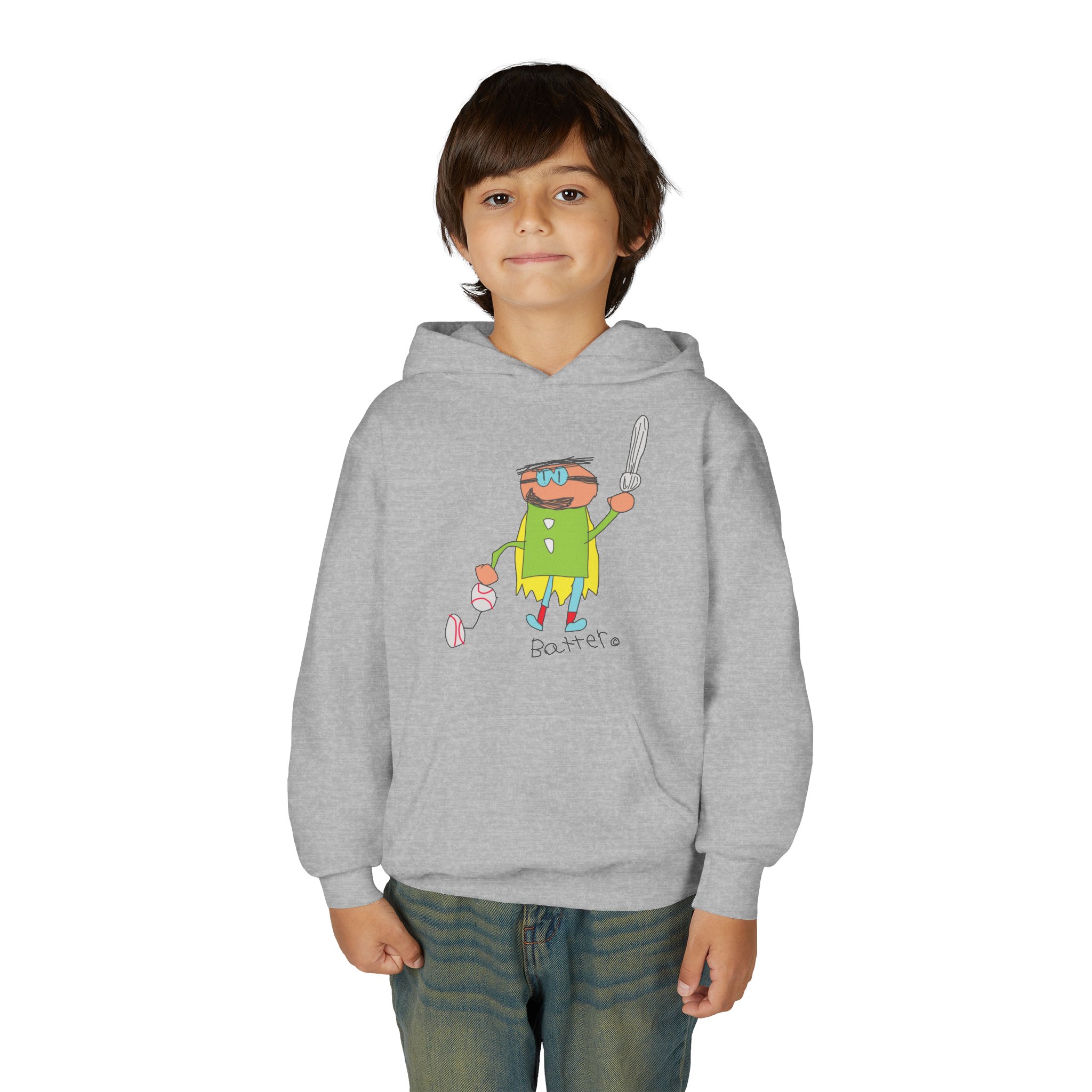 Soft, cozy youth hoodie with our whimsical Batter character art, warm fabric, and a roomy kangaroo pocket. Durable details keep it comfy through school mornings, park trips, and craft time.