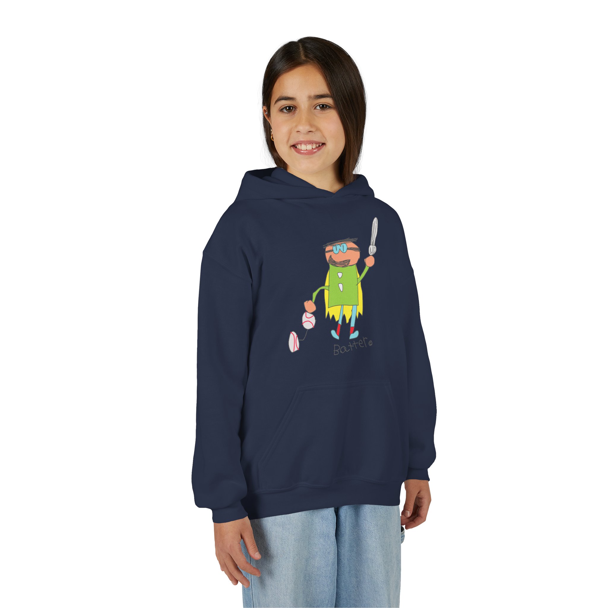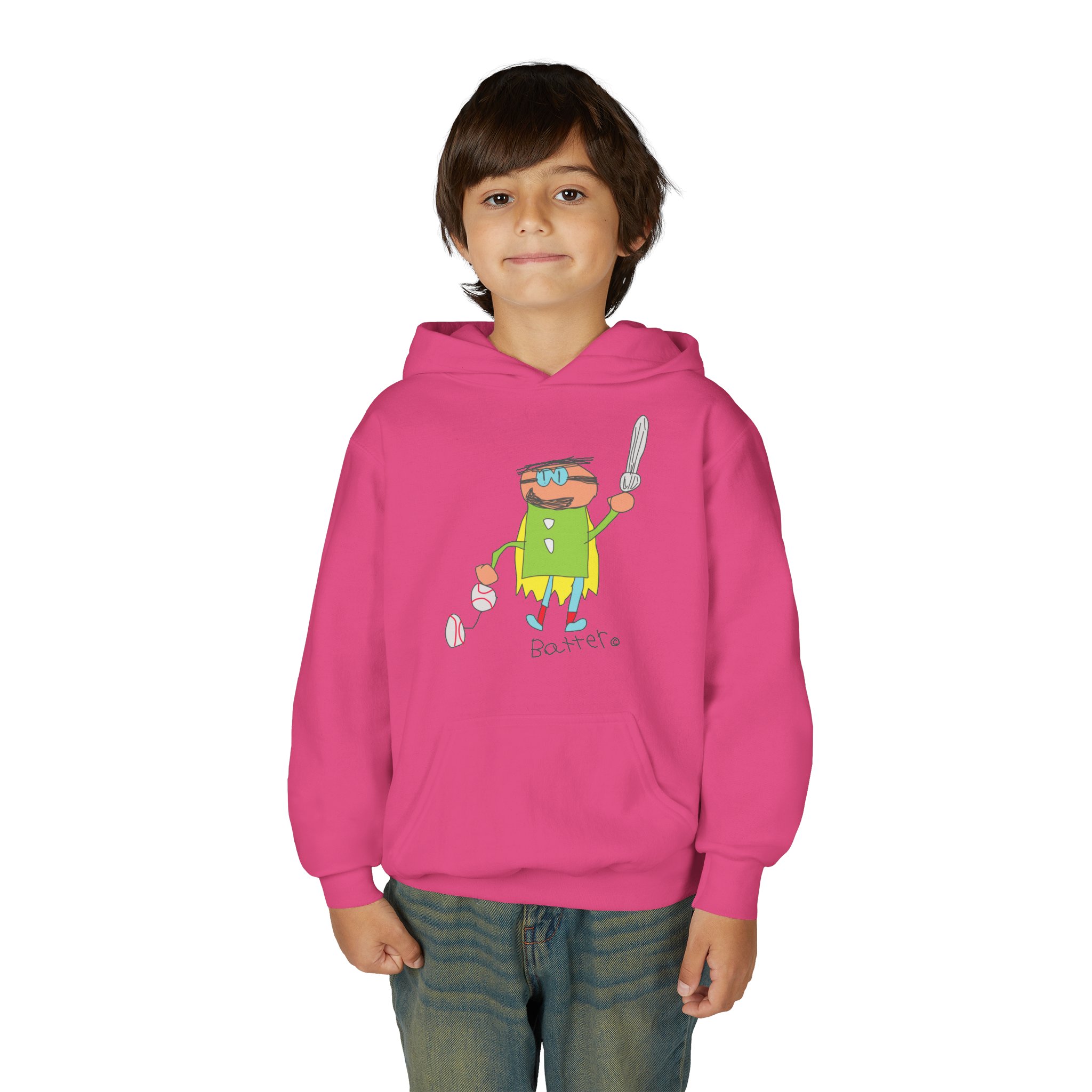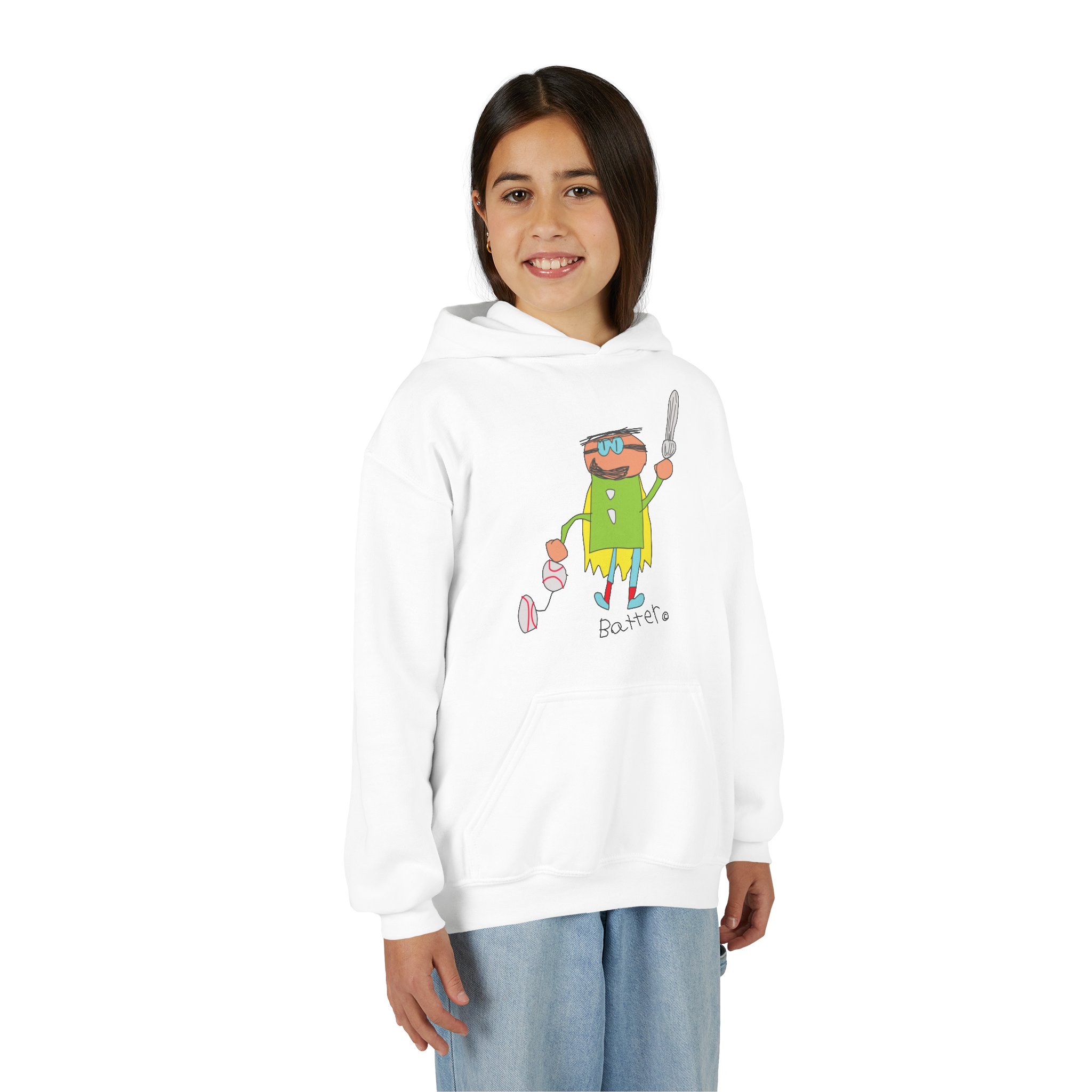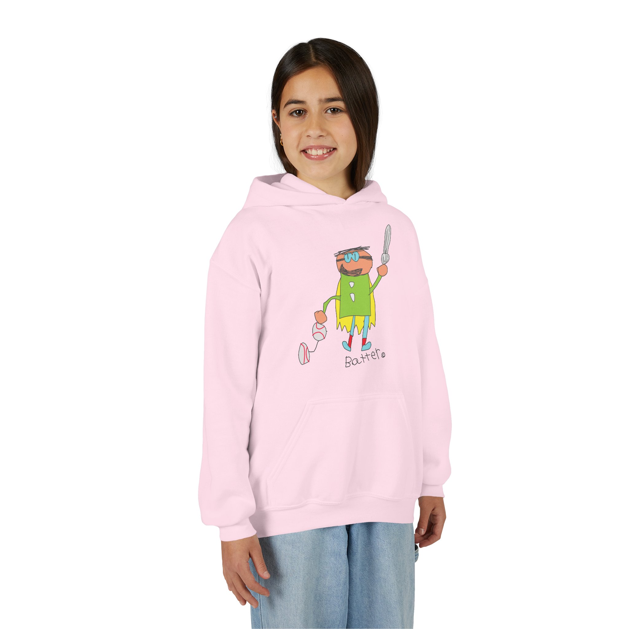 Soft, cozy youth hoodie with our whimsical Batter character art, warm fabric, and a roomy kangaroo pocket. Durable details keep it comfy through school mornings, park trips, and craft time.