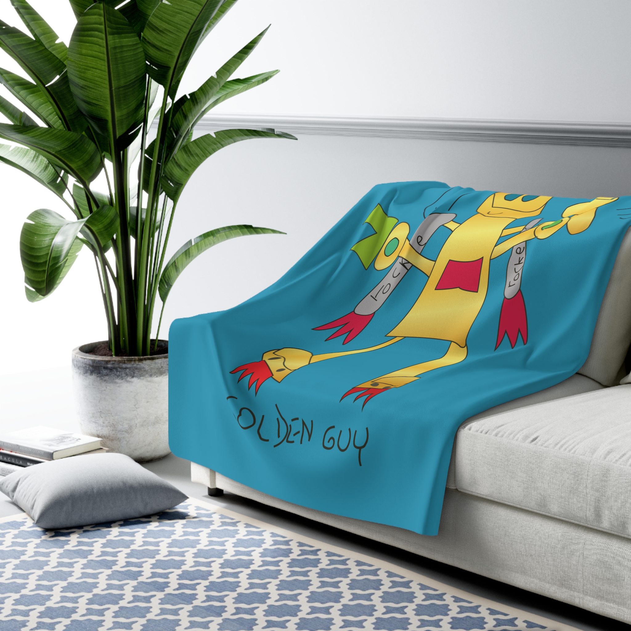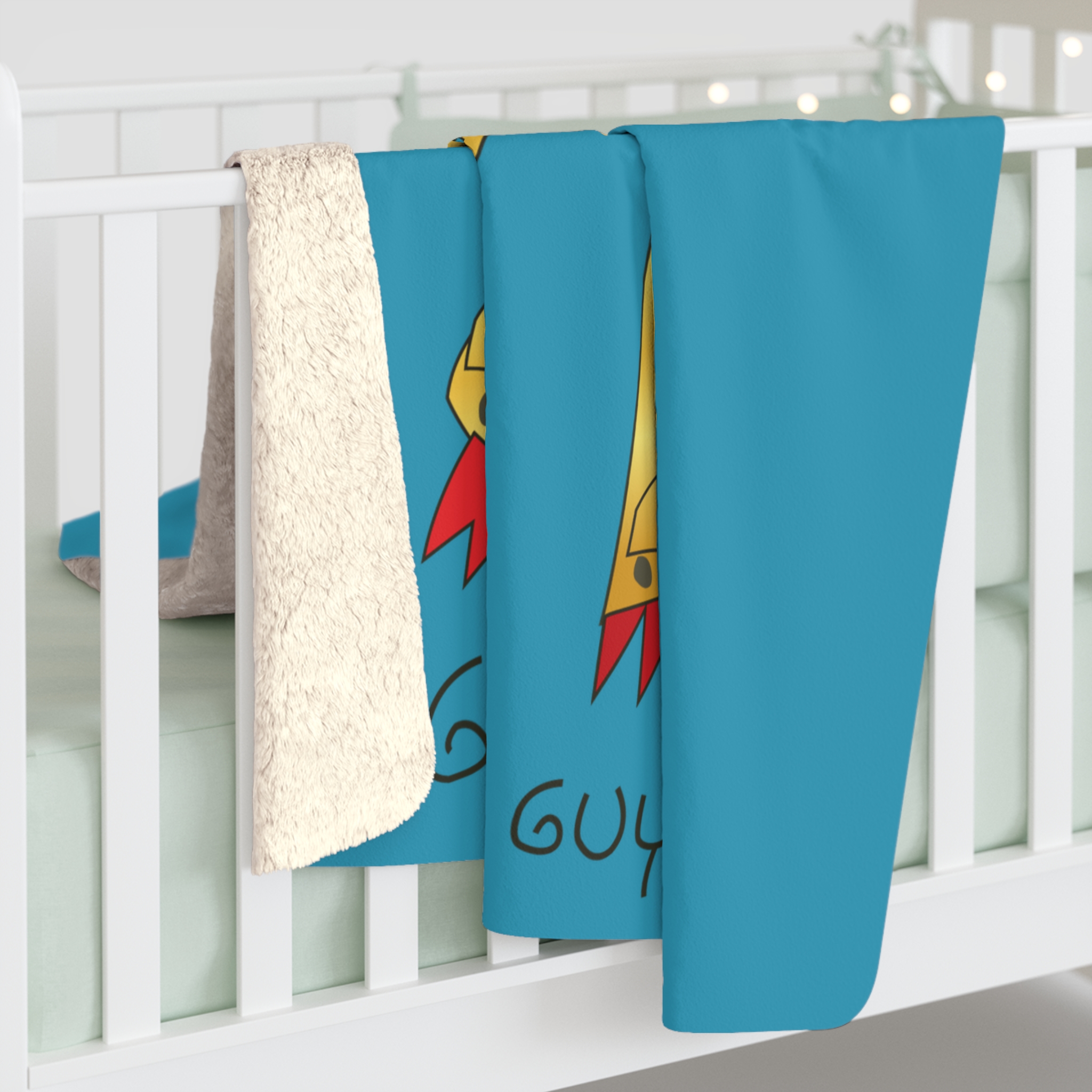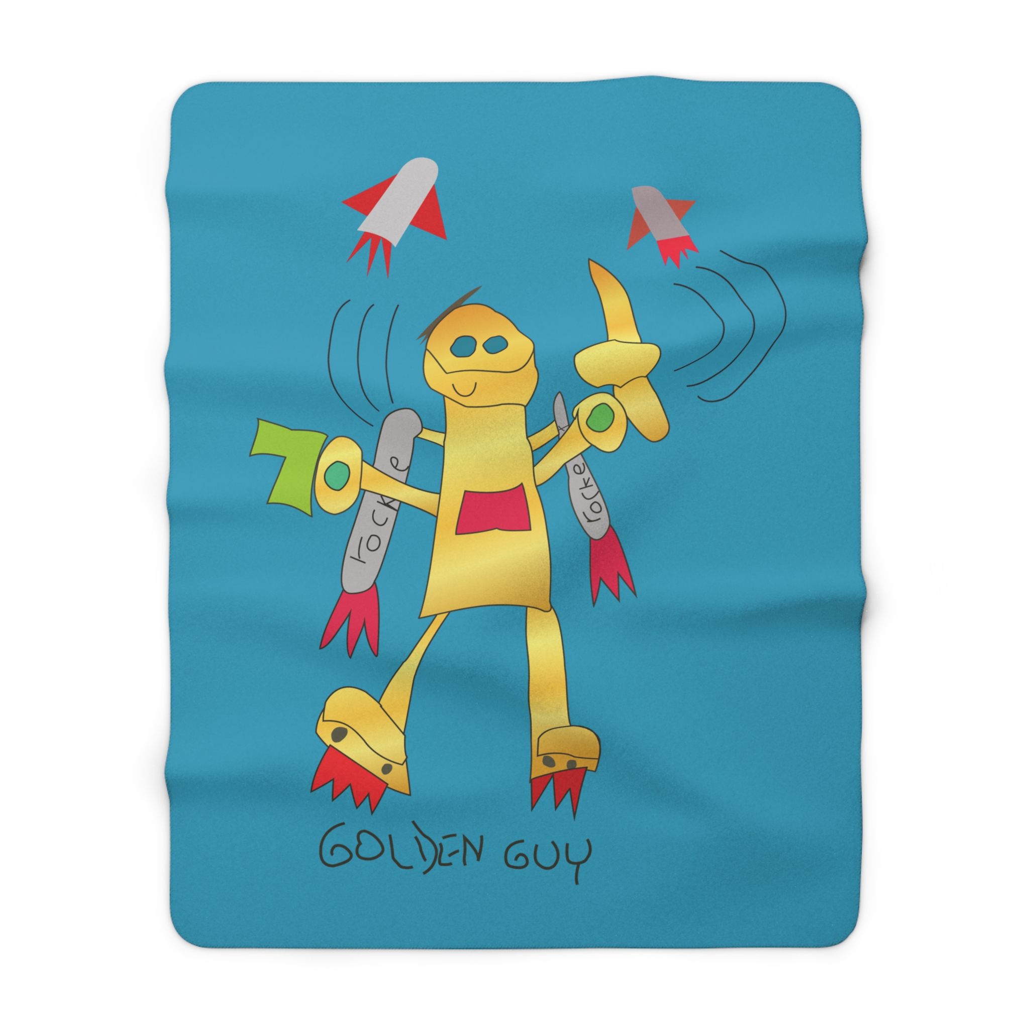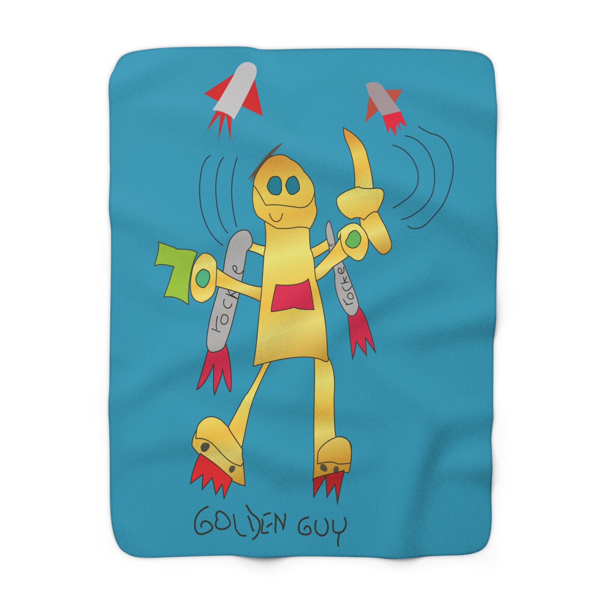 Wrap yourself in playful comfort with the Golden Guy Sherpa Fleece Blanket. Featuring a cheerful hand‑drawn robot on bright turquoise with whimsical rocket accents, it’s equal parts cozy and fun. Plush sherpa underside keeps you warm, while the smooth printed face makes the art pop. Durable 100% polyester with hemmed edges means it stays soft and sturdy wash after wash.
