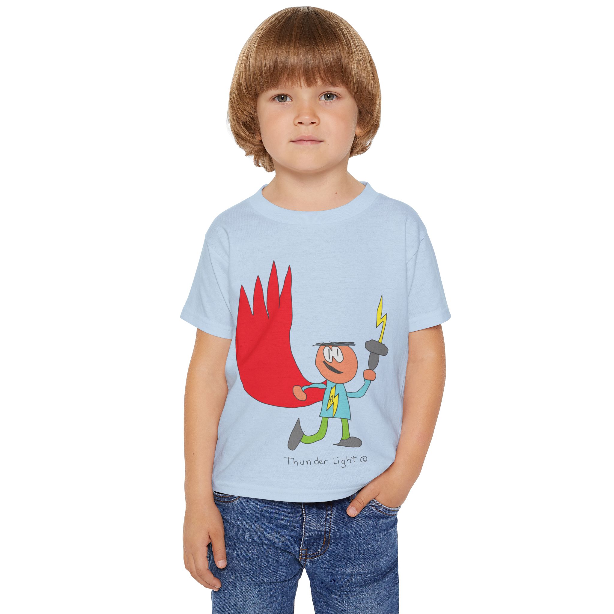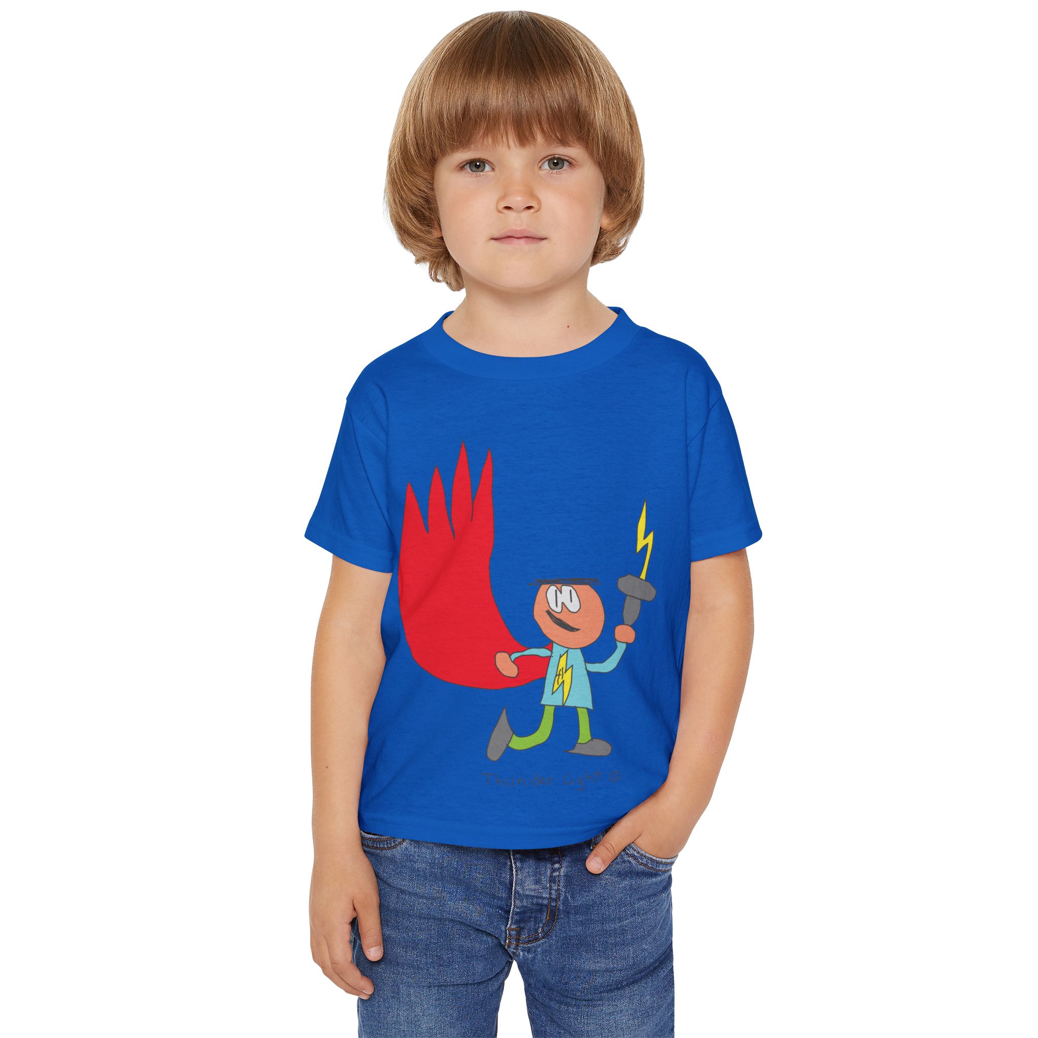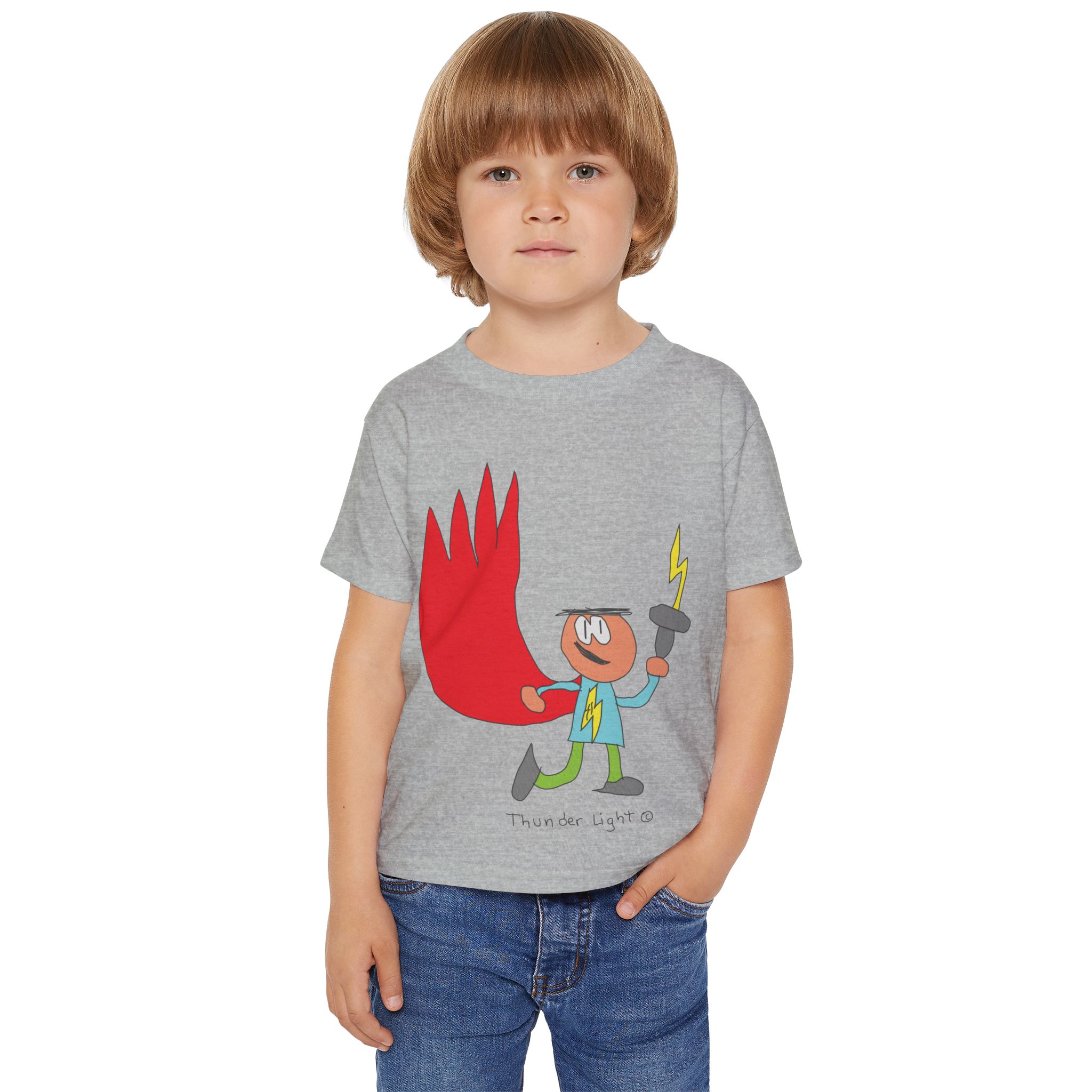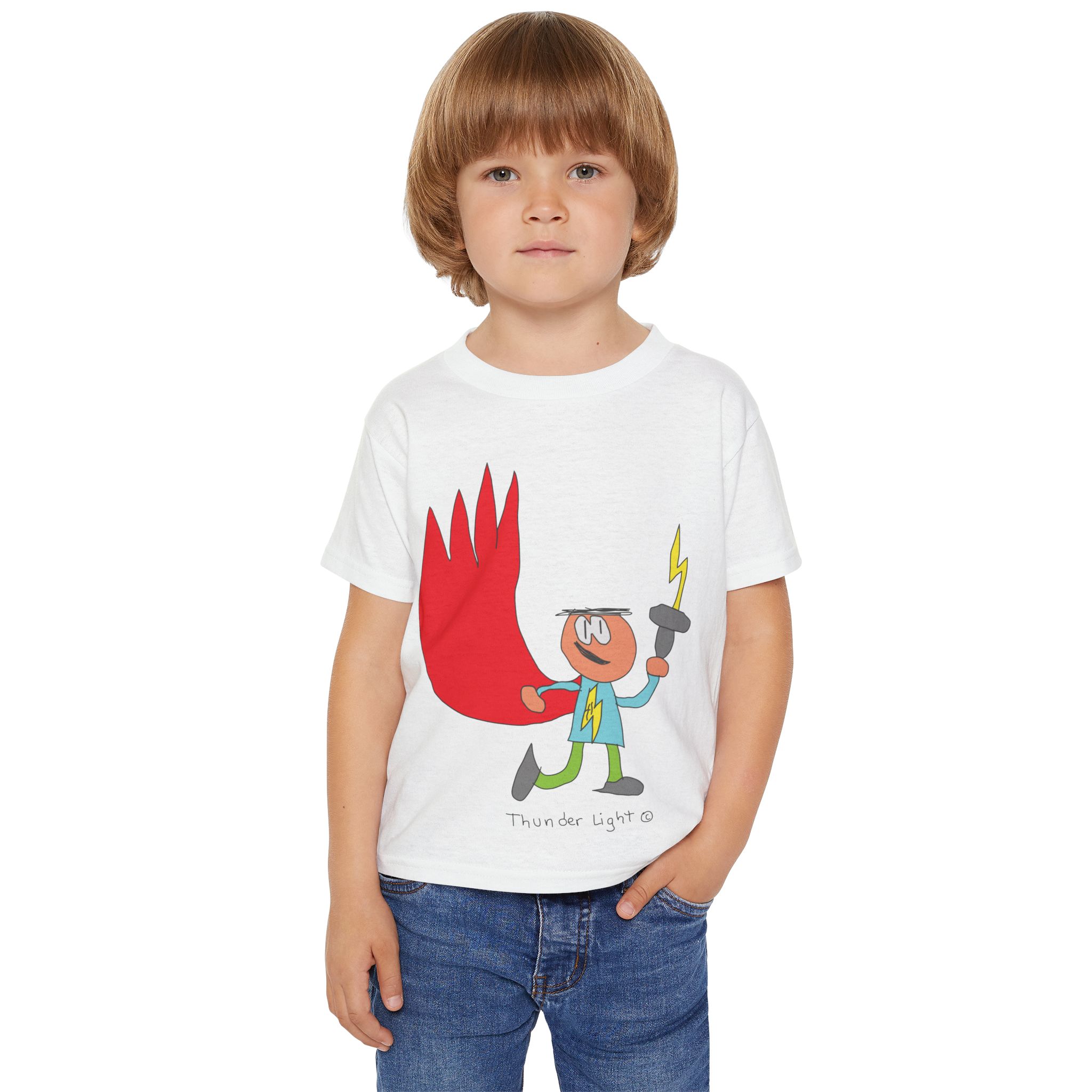 Cartoon hero energy in a toddler tee. Red cape, lightning bolt, durable cotton — built for nonstop play.