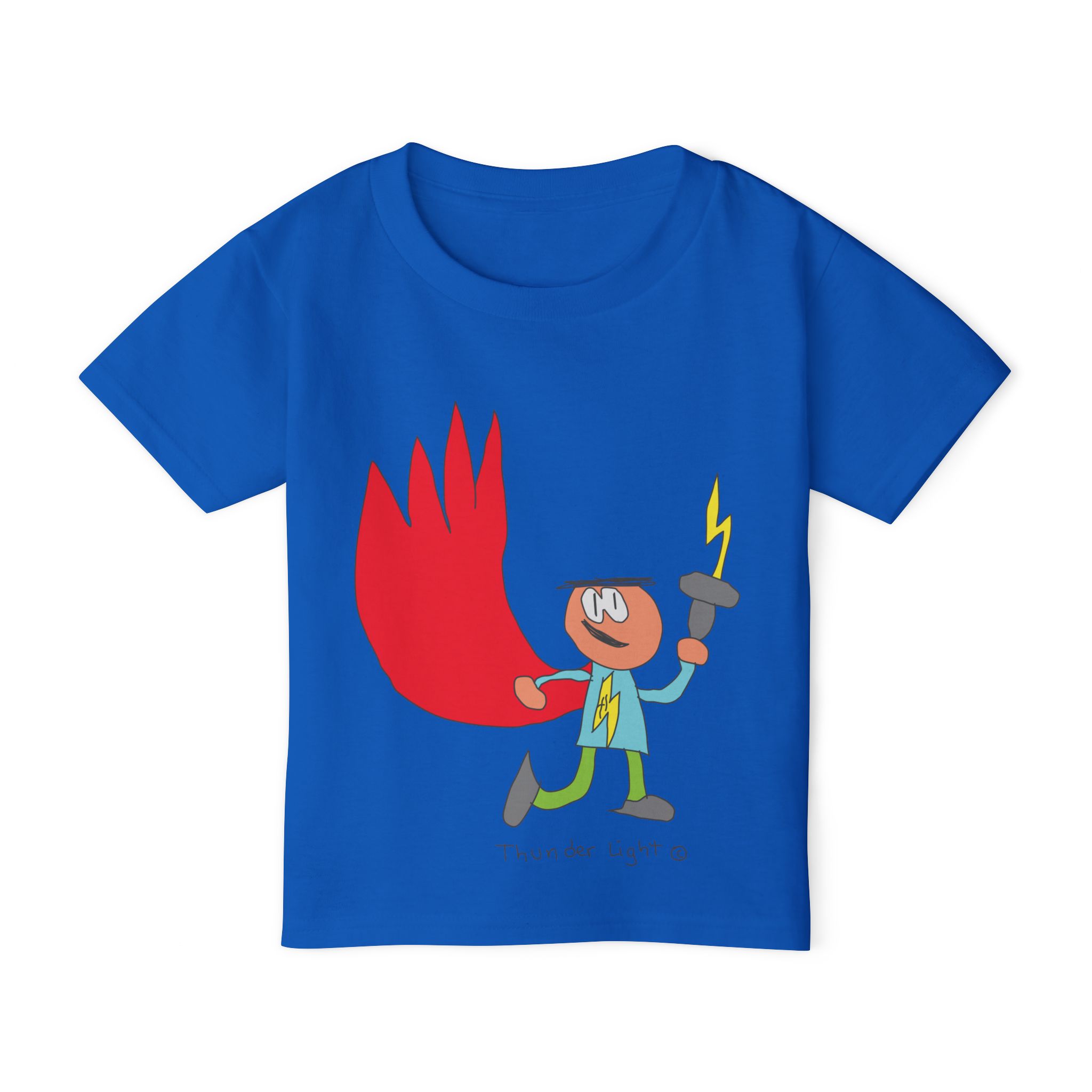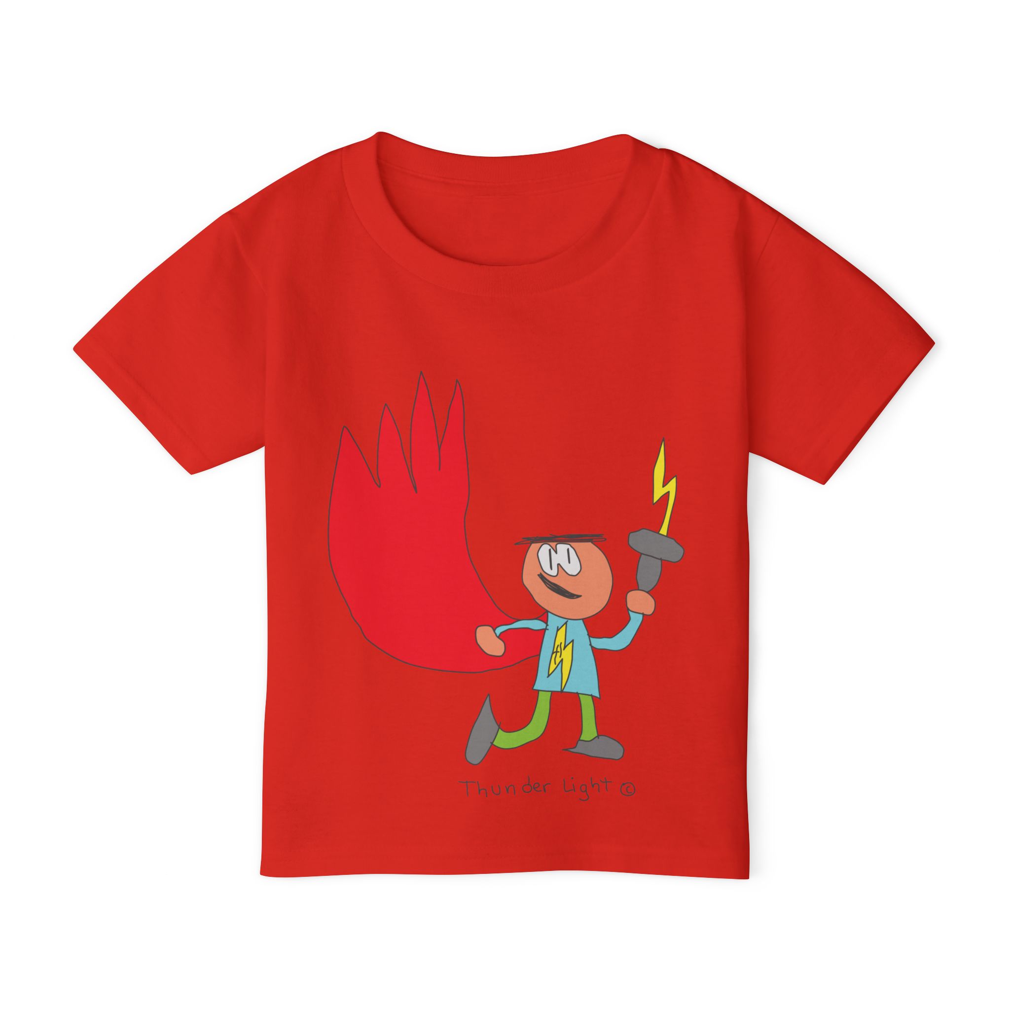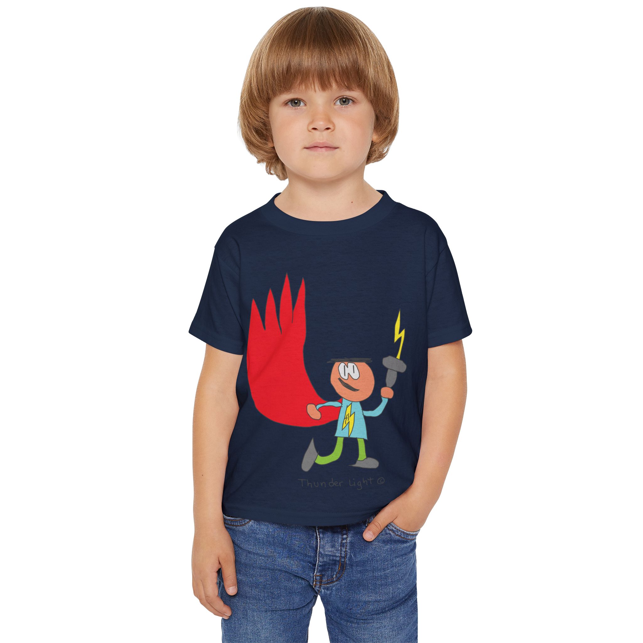 Cartoon hero energy in a toddler tee. Red cape, lightning bolt, durable cotton — built for nonstop play.