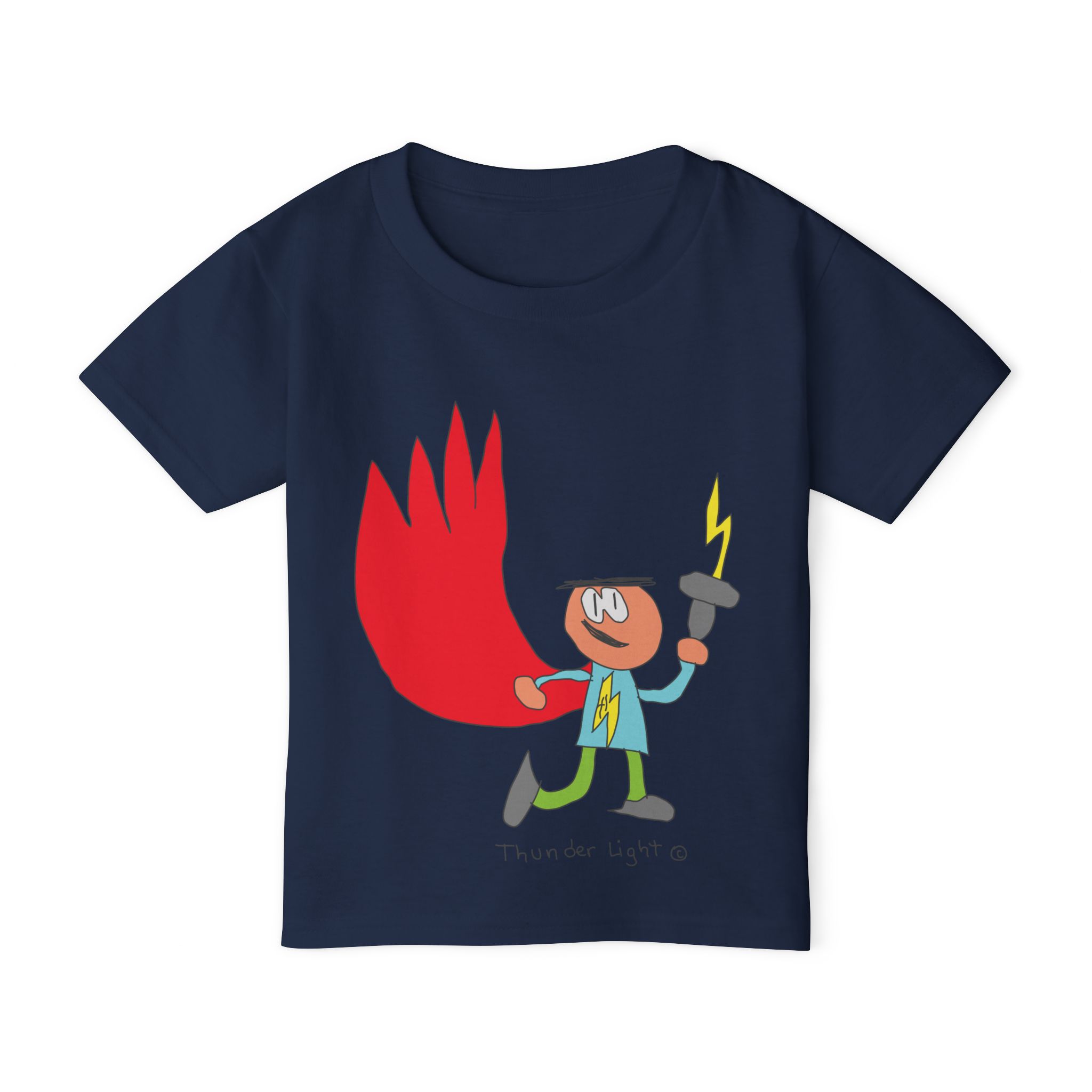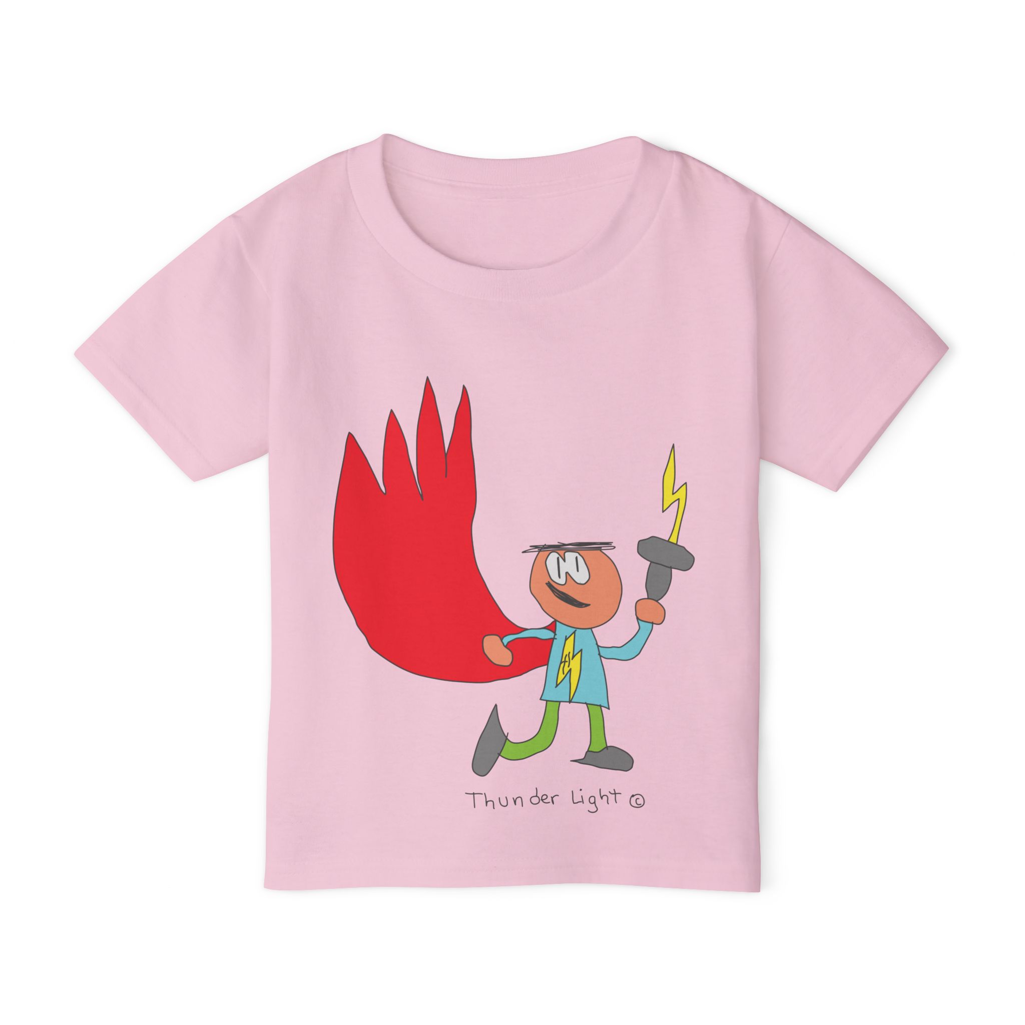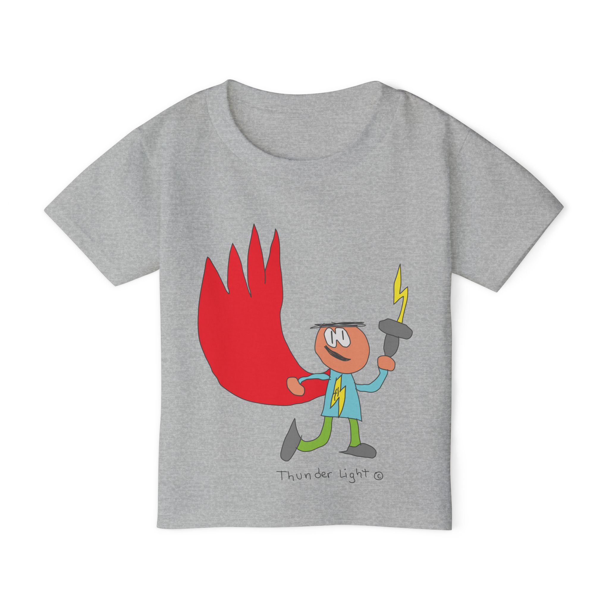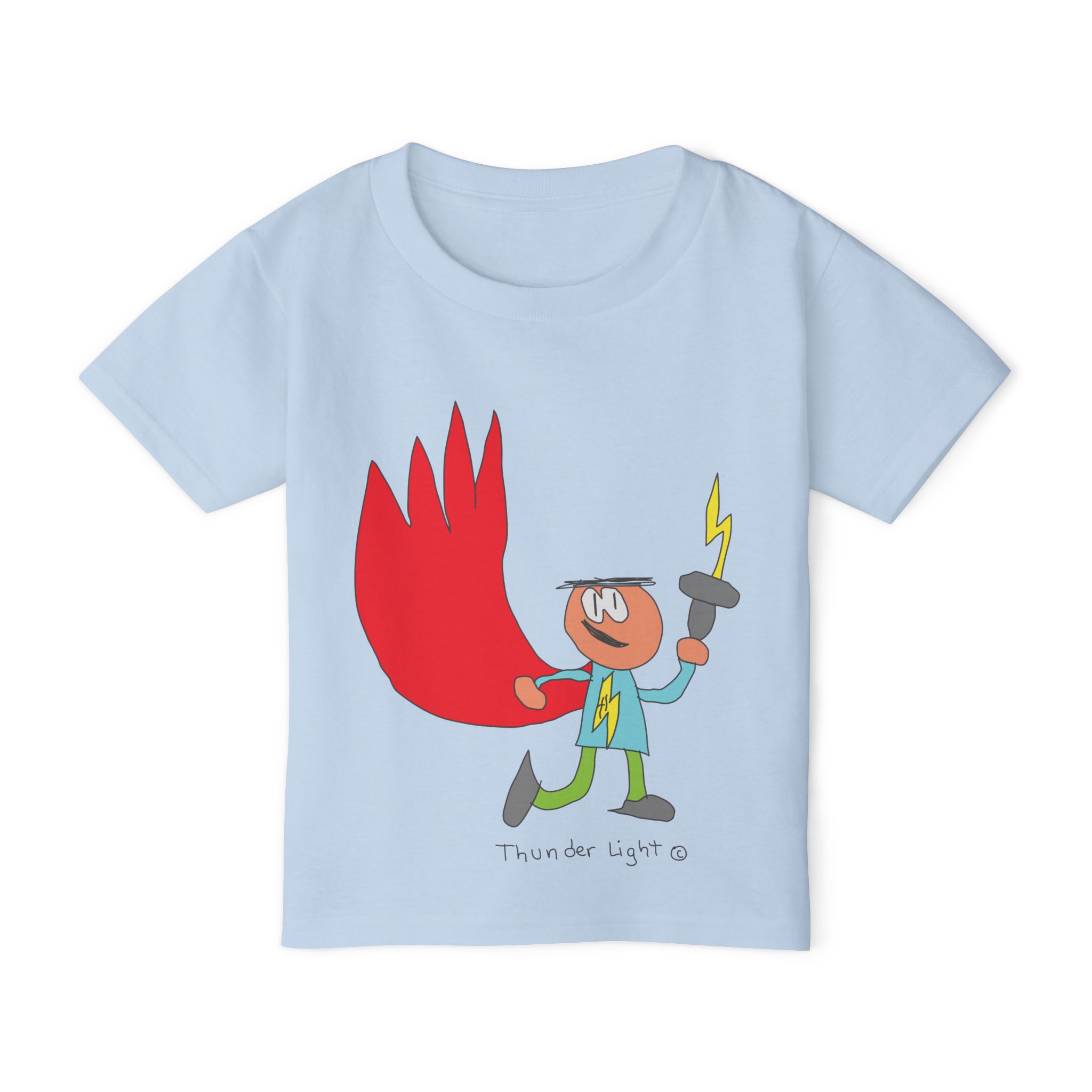 Cartoon hero energy in a toddler tee. Red cape, lightning bolt, durable cotton — built for nonstop play.